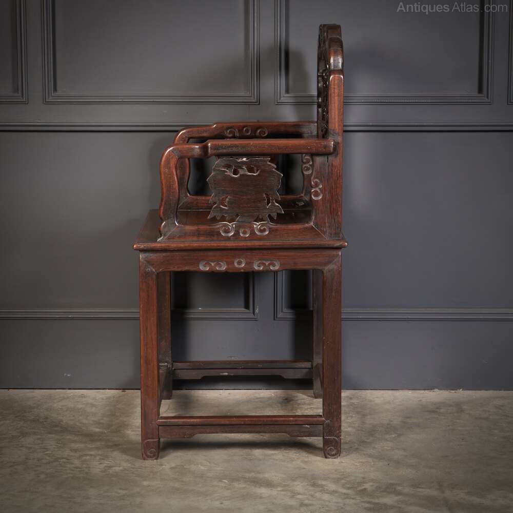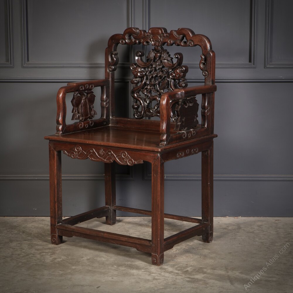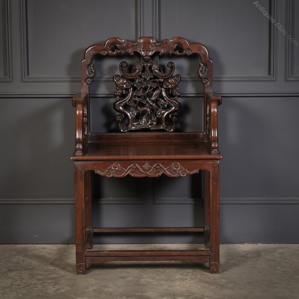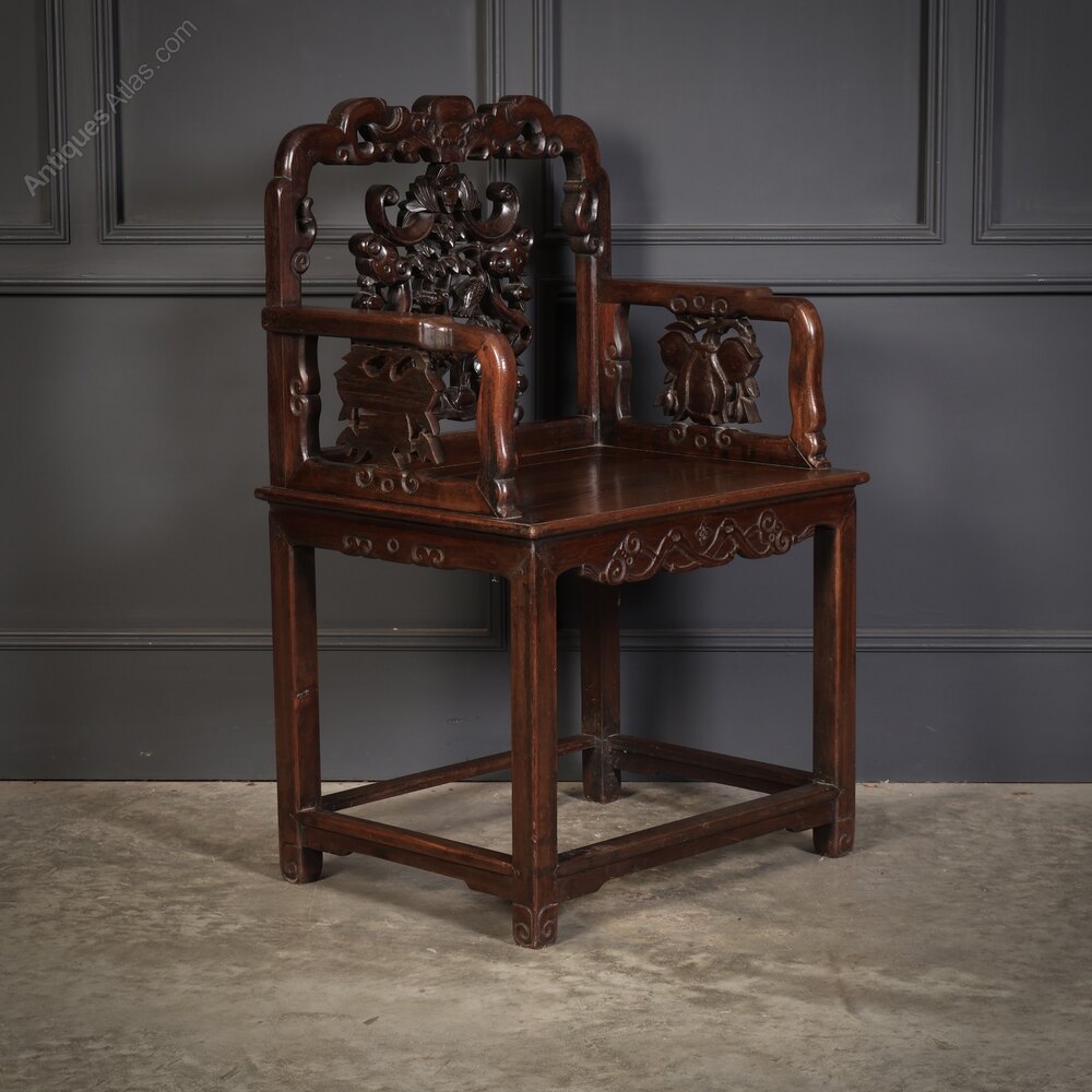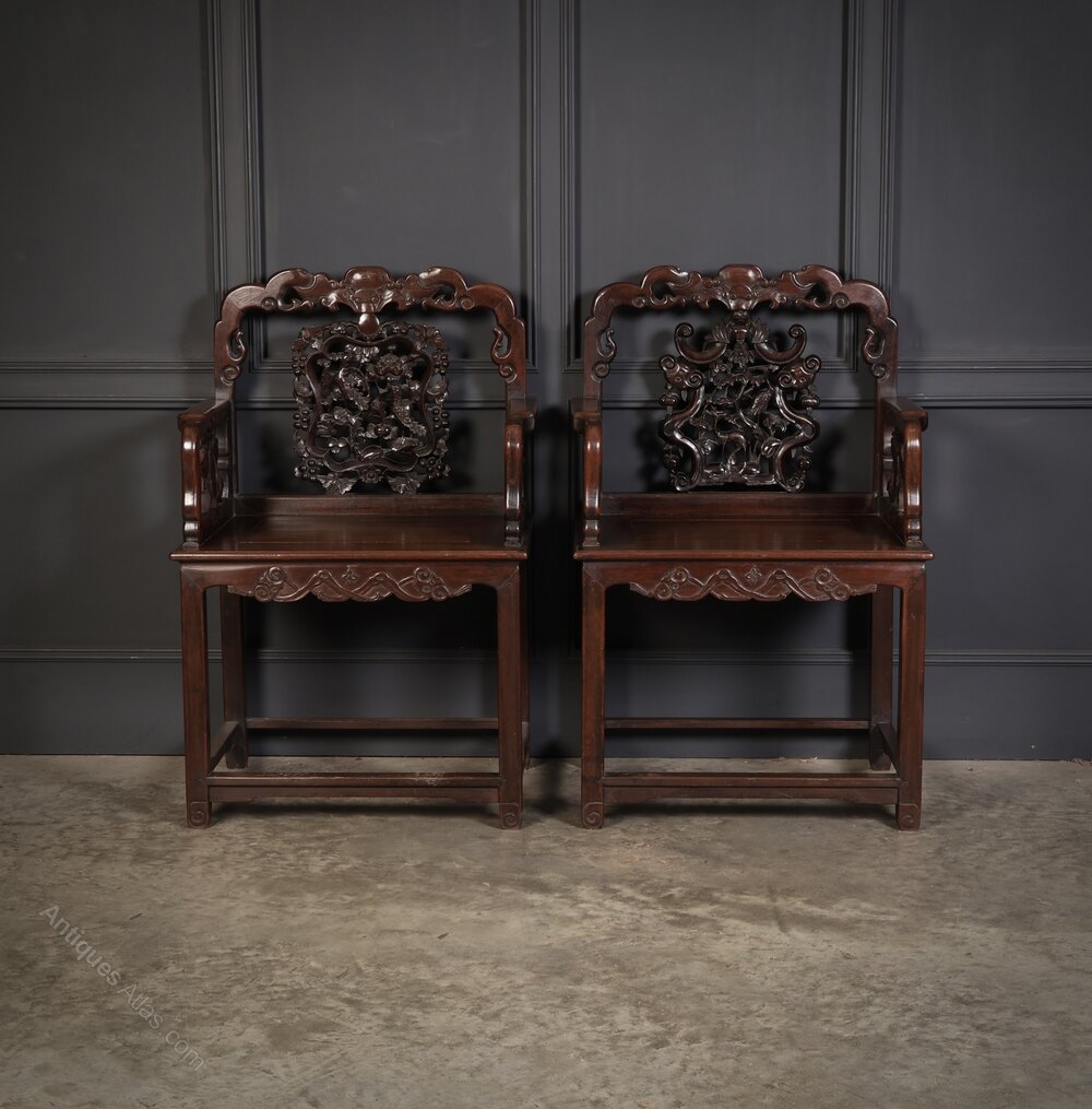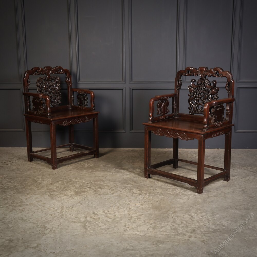 A fine pair of late Qing dynasty Chinese carved armchairs, featuring intricate openwork carving to the backrest with traditional foliate and auspicious motif designs.The arm supports are decorated with finely detailed pierced panels, and the apron is adorned with subtle scrolling motifs.