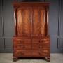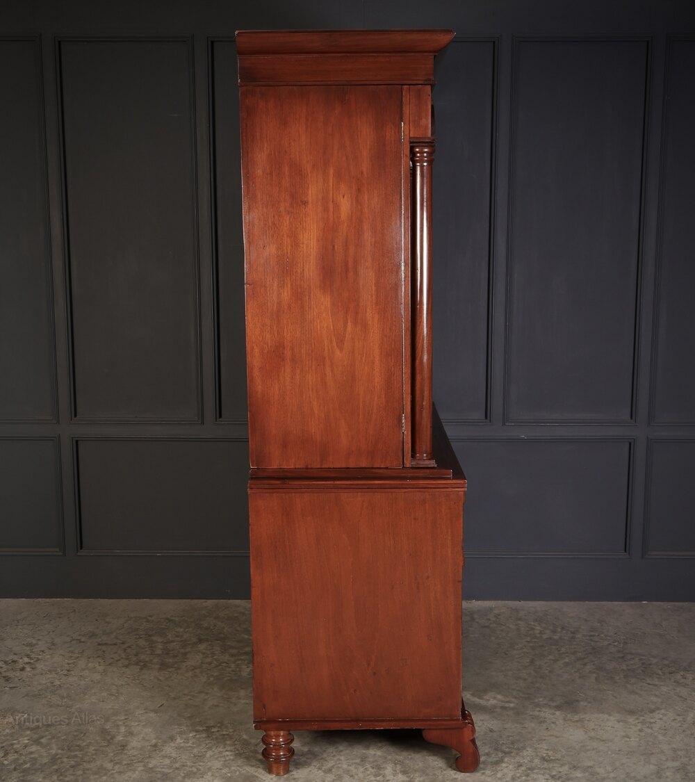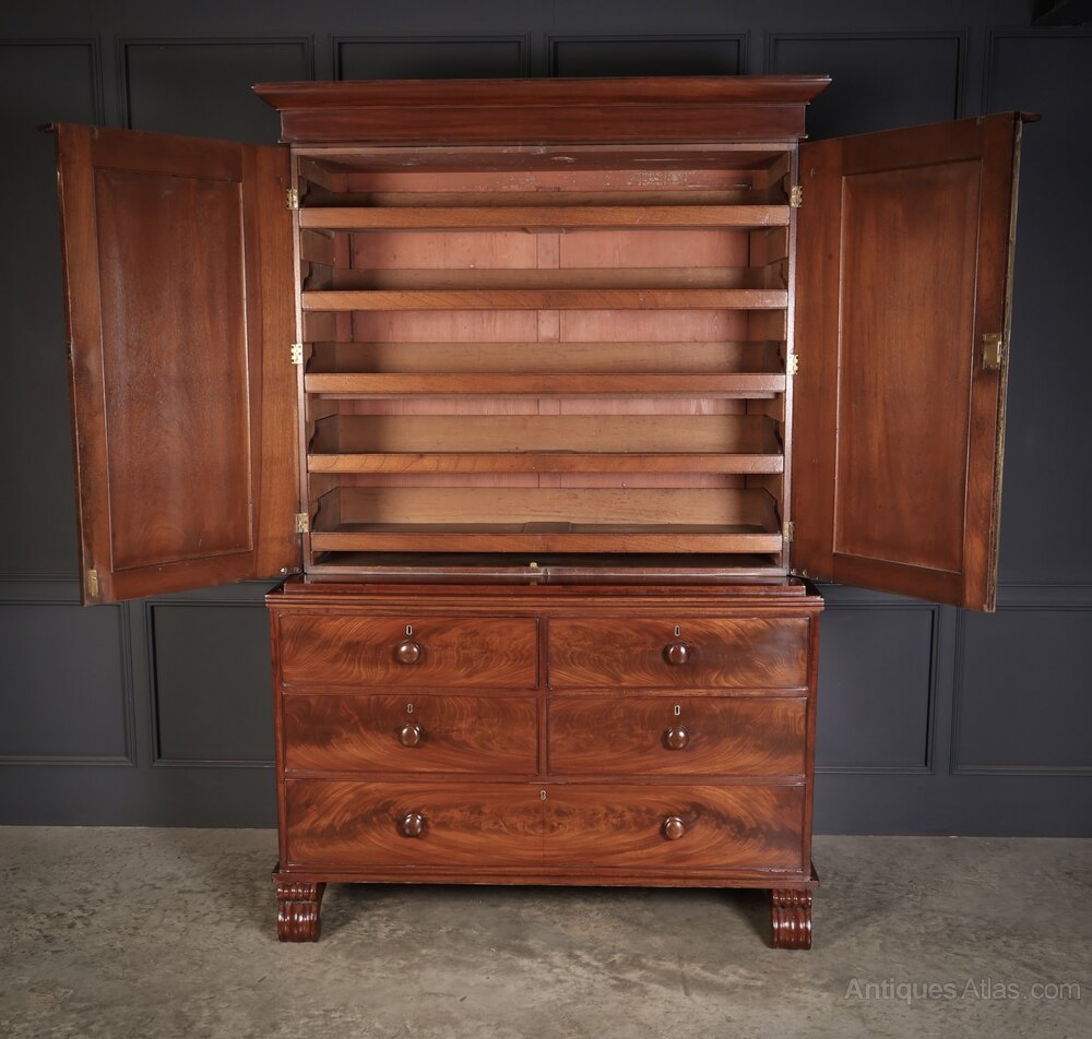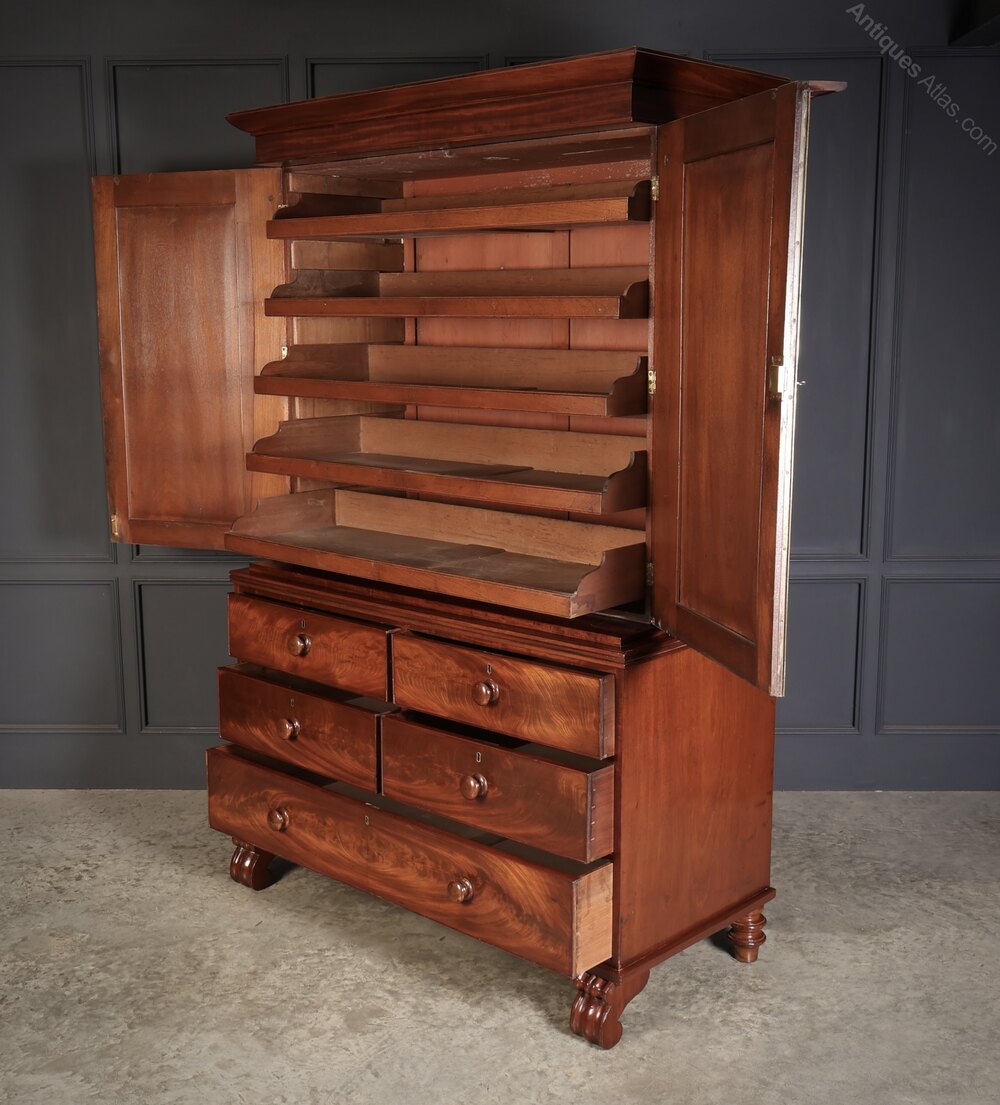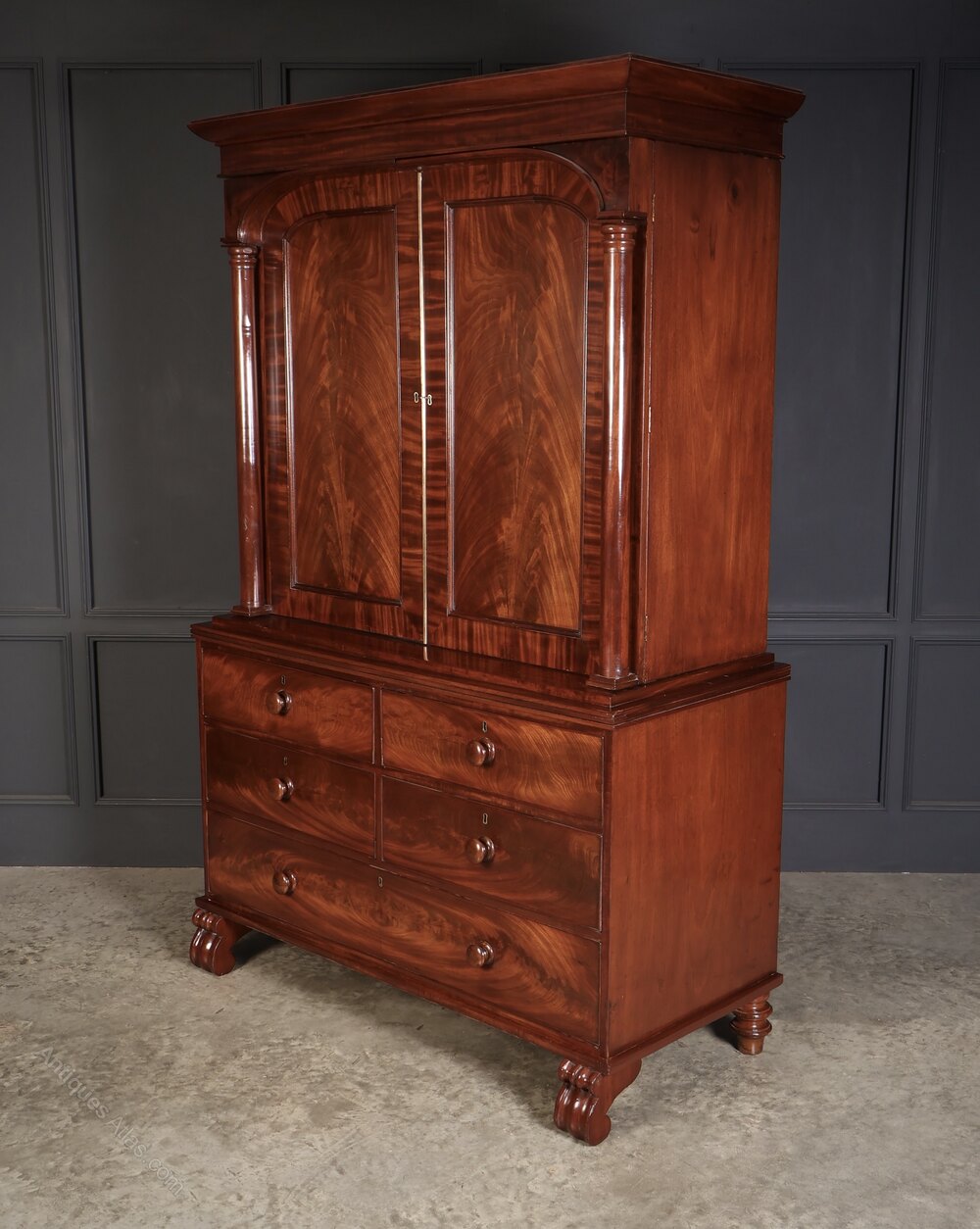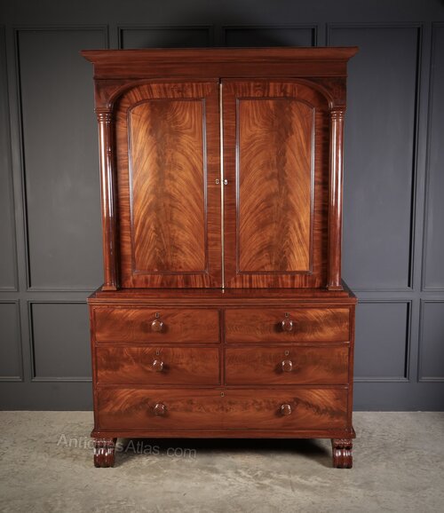 A fine early 19th-century Scottish mahogany linen press of excellent colour and figure, offered in very good condition.The upper section features a pair of beautifully panelled doors with decorative columns either side, opening to reveal five sliding trays, which could easily be replaced with a hanging rail if desired.