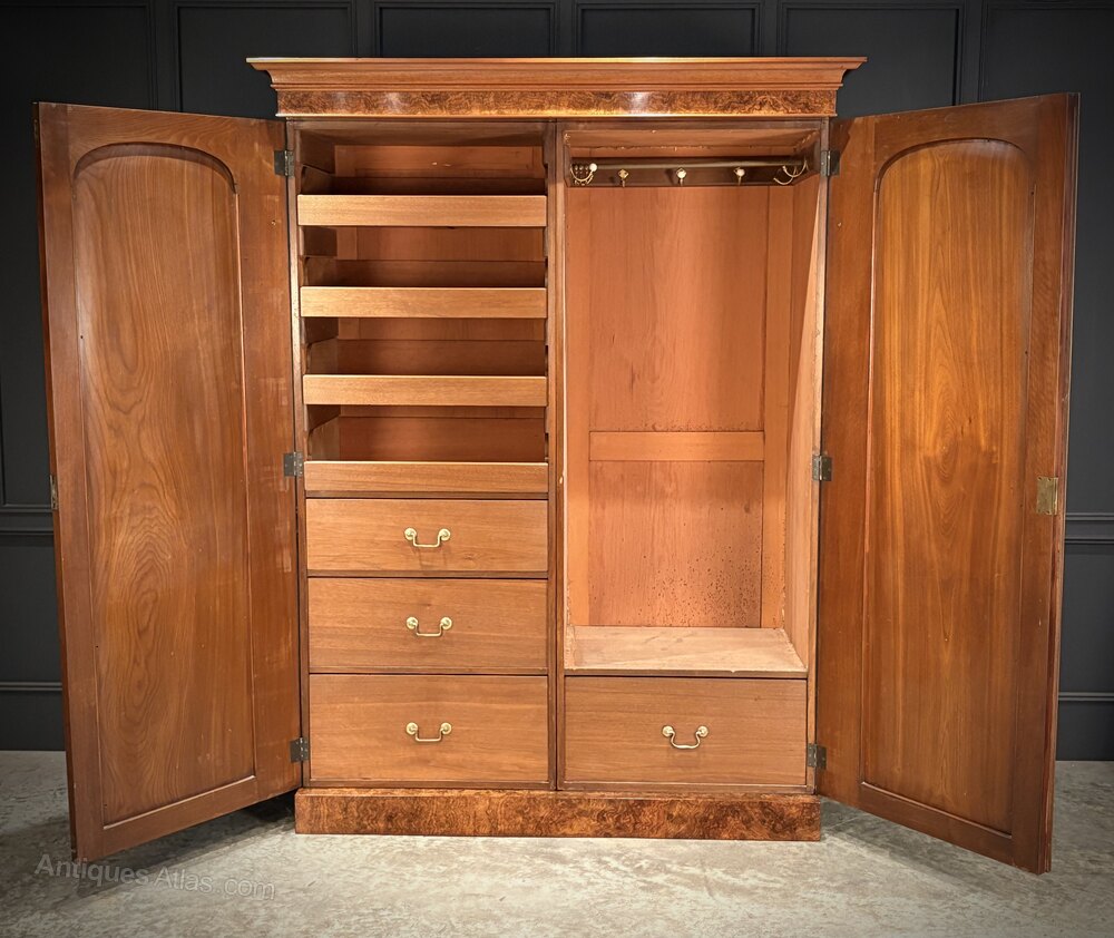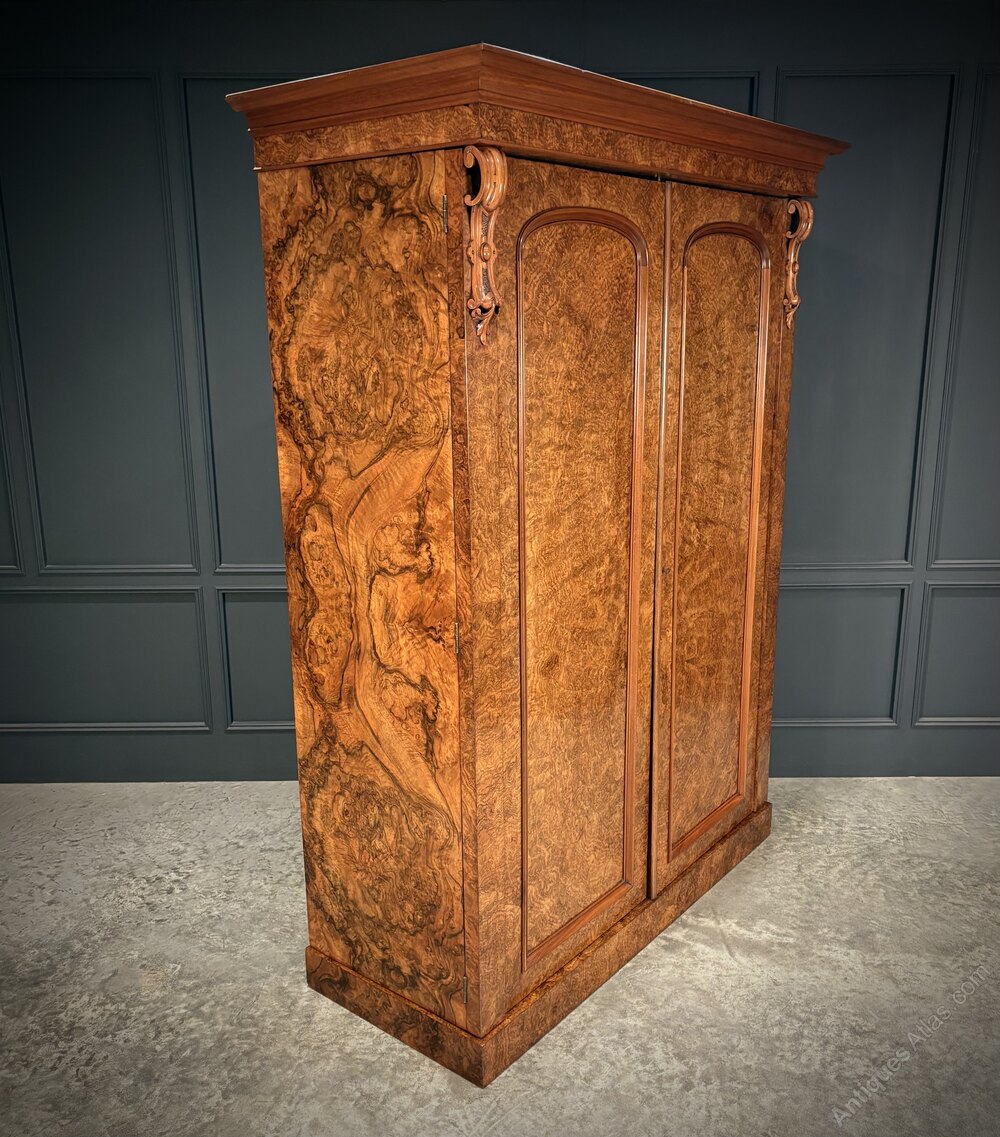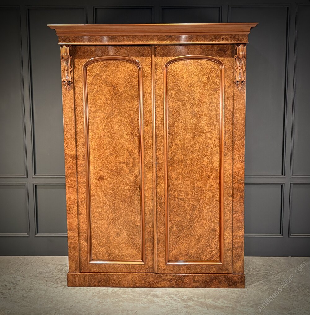 A stunning 19th-century Victorian burr walnut wardrobe of exceptional quality, presented in very good condition.This elegant piece breaks down into four sections for easy transport — the two main body sections split vertically, with a detachable cornice top and plinth base.