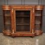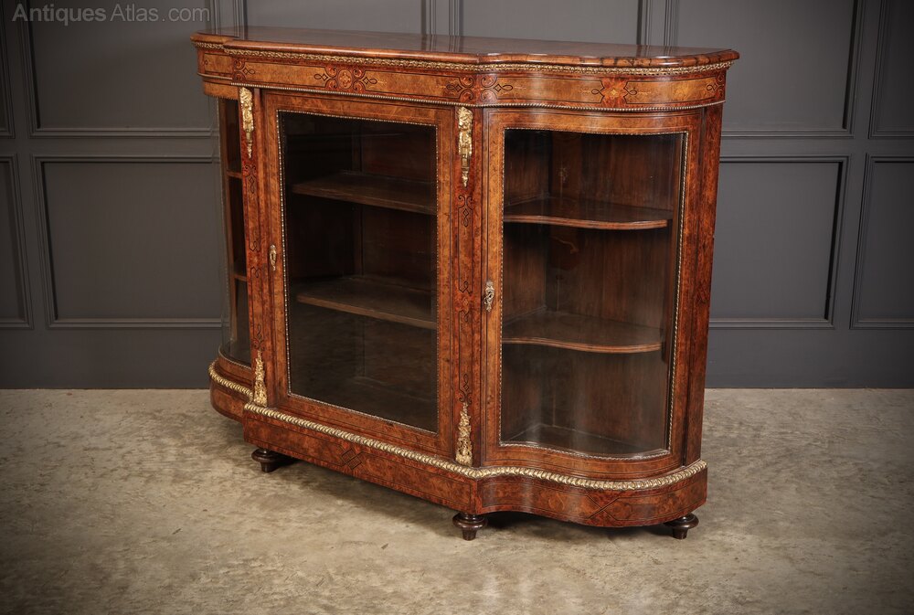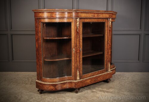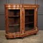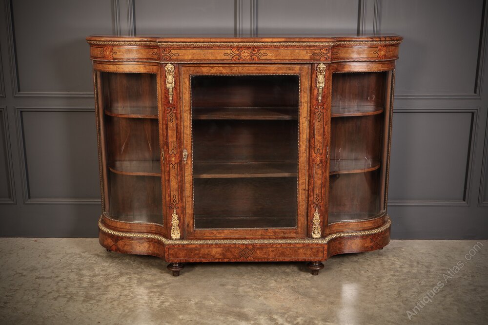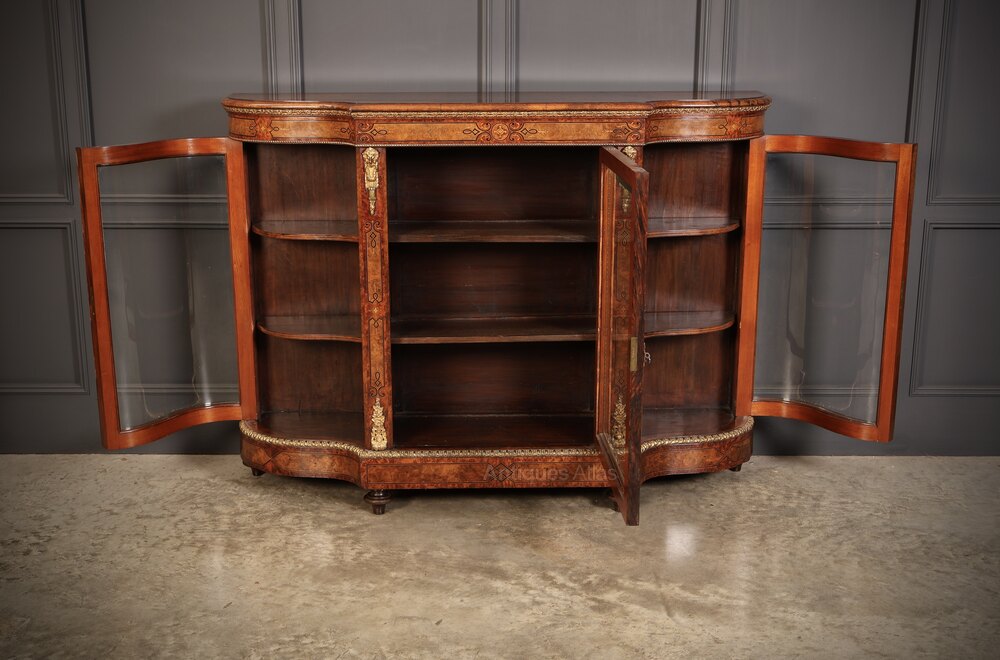 A superb Victorian burr walnut credenza in excellent condition. Featuring a shaped top with fine marquetry inlay and a detailed frieze above a central door fitted with a bevelled glass panel within an ebony-strung frame.The central door, flanked by decorative ormolu mounts, retains its working lock and key.