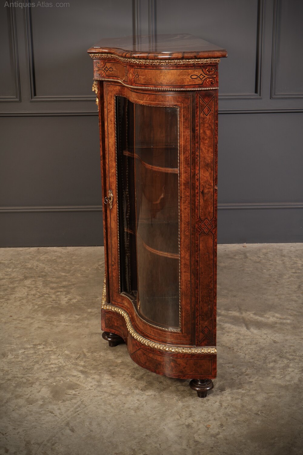 Two further doors with curved glass fronts, brass edging, and string-inlaid frames each open to reveal two internal shelves.