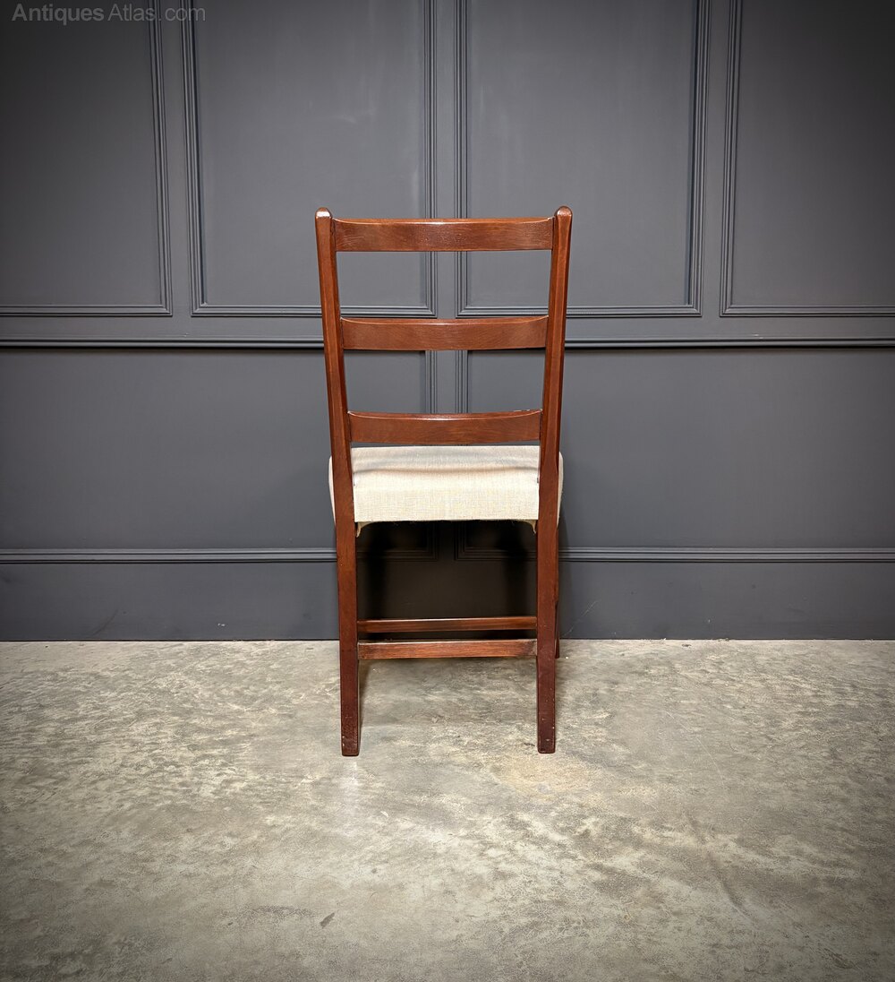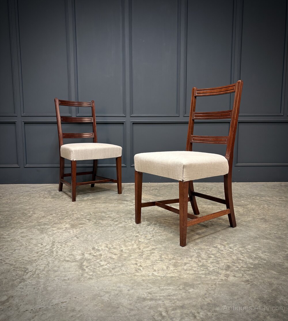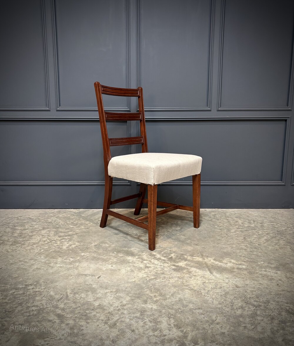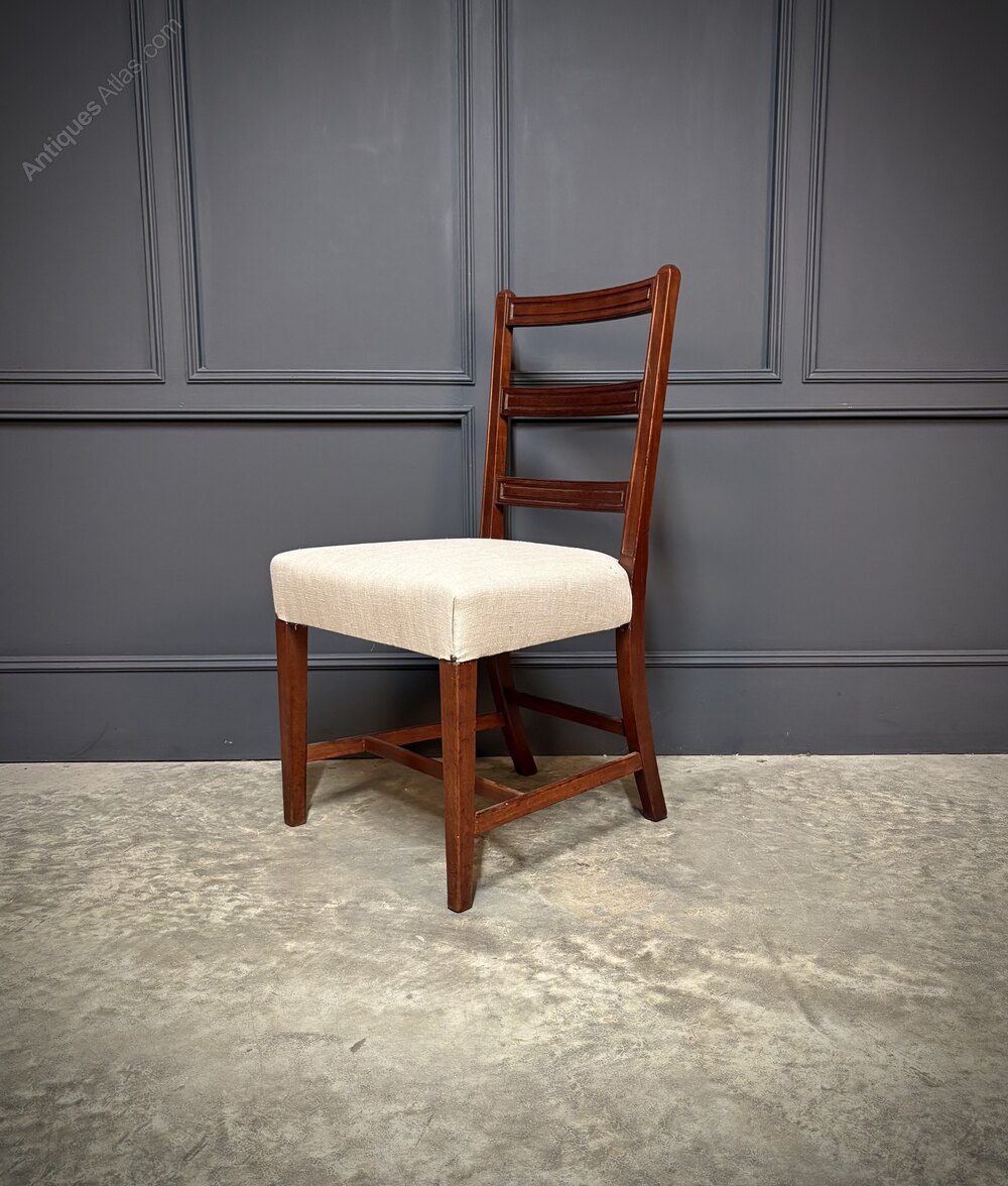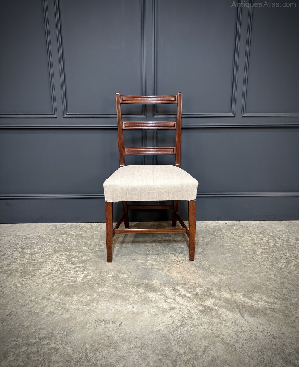This is a rare set of eighteen Georgian mahogany dining chairs, offering a magnificent solution for large-scale dining with elegance and period charm. Dating from the late Georgian period, these chairs are finely crafted from solid mahogany, each chair features a classic ladder-back design with reeded horizontal rails, squared legs, and traditional H-stretchers, reflecting the timeless balance and symmetry of Georgian style.All eighteen chairs have been newly and professionally upholstered in a neutral grey linen, a tasteful and versatile fabric that enhances the warmth of the mahogany while offering a fresh, updated look. The upholstery has been finished to a high standard, ensuring both comfort and durability for regular use.