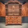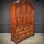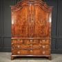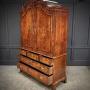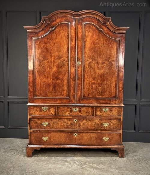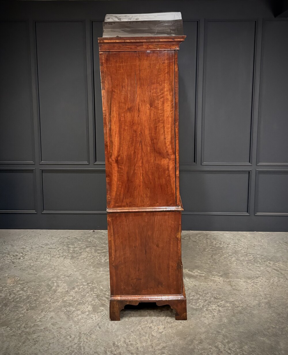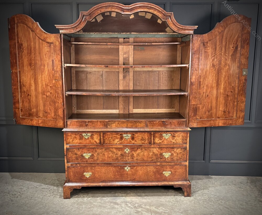 A fine large 18th-century walnut cabinet, beautifully crafted with richly figured walnut, displaying a warm, glowing patina.The shaped and molded cornice lifts off, and the upper section can be flat-packed for easier transport.