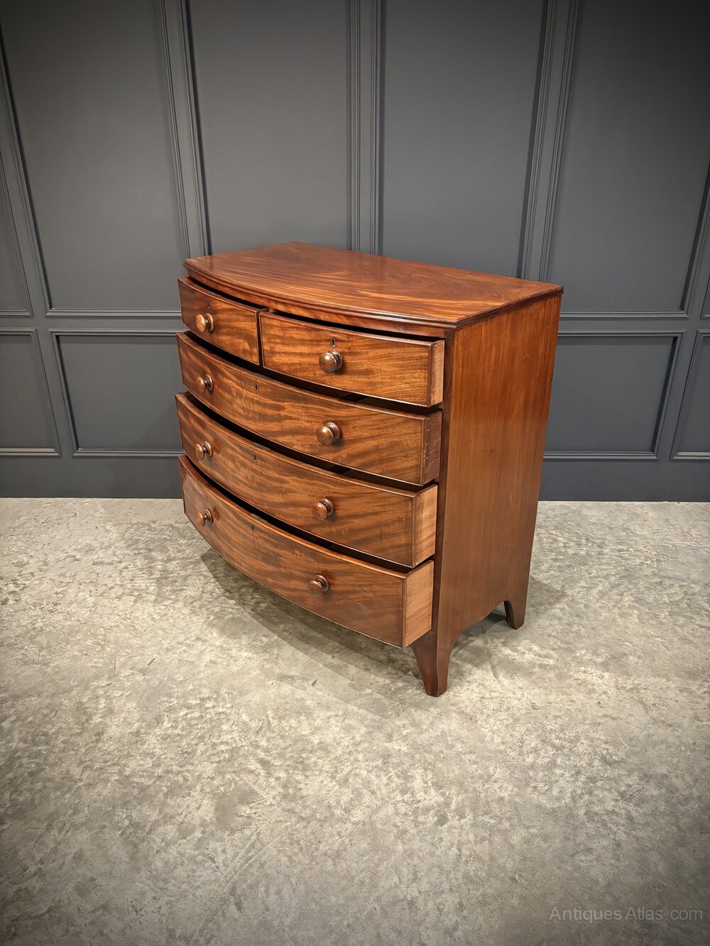 A fine Regency mahogany bow front chest of drawers, dating to 1810.Beautiful mahogany with a rich, warm patina, the chest features an elegant bowed front and good original colour.