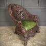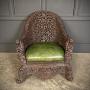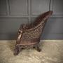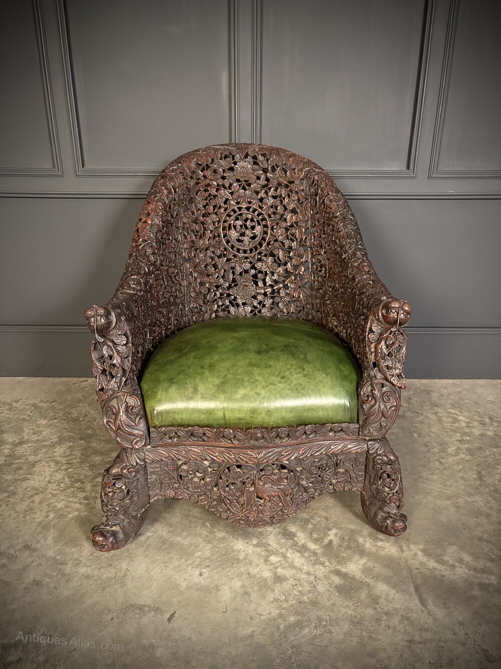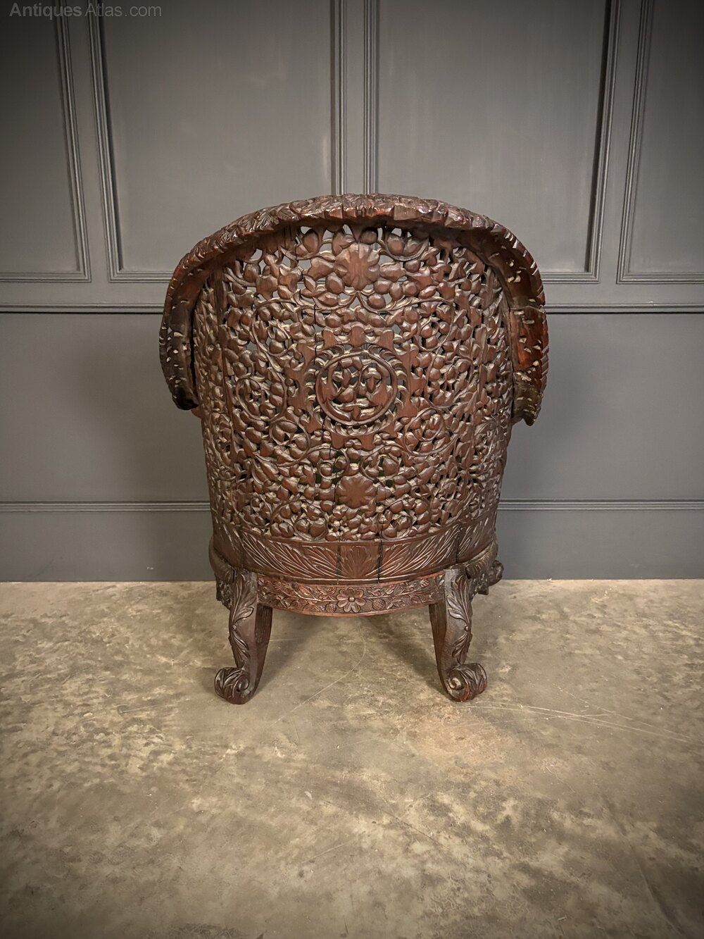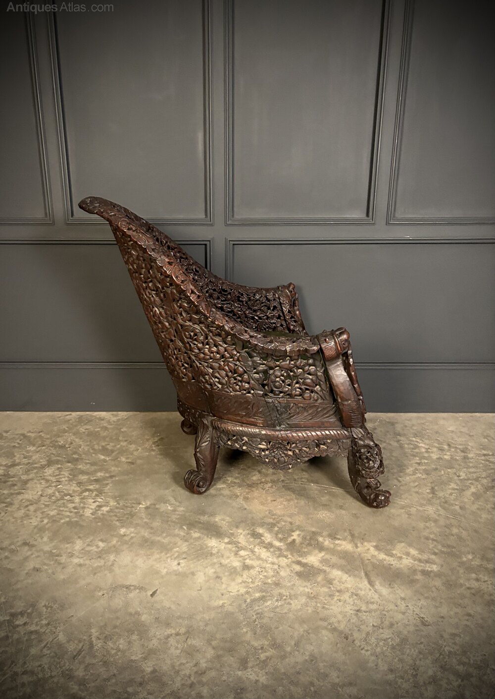A finely carved Burmese hardwood armchair, dating to circa 1880, showcasing exceptional carvings throughout.The richly detailed frame is intricately hand-carved with dense foliate and scrolling motifs, extending across the legs, arms, seat rails, and the elegantly curved backrest, which features pierced carving and a central medallion.