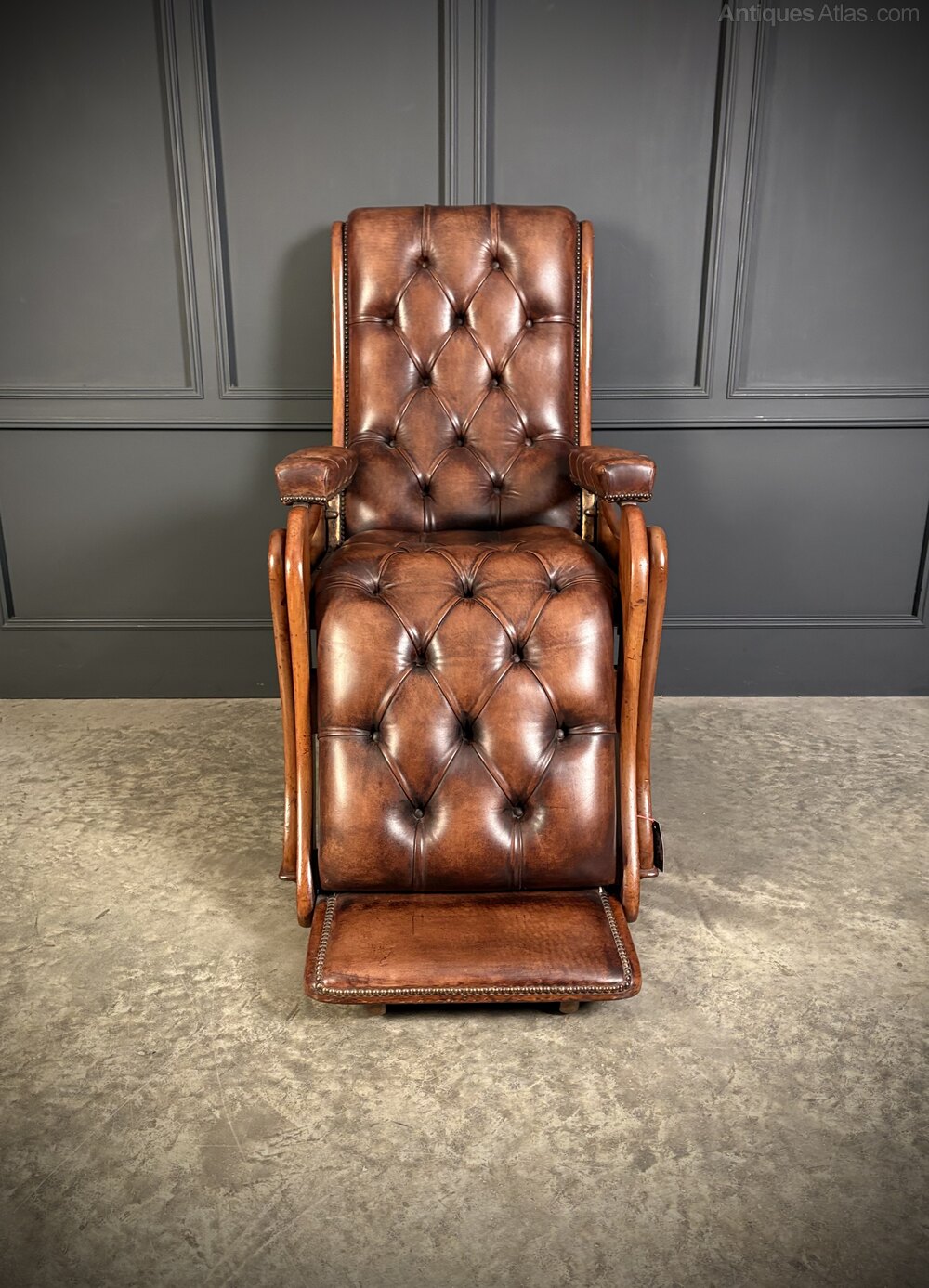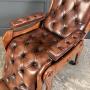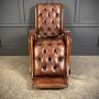 The seat, back, and leg rest are all deeply buttoned for comfort, complemented by padded, buttoned armrests.
