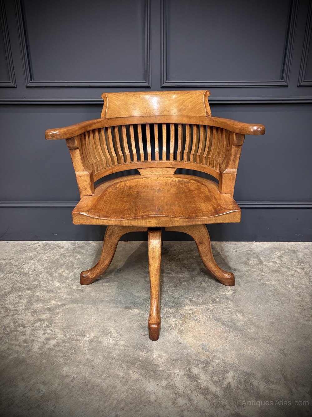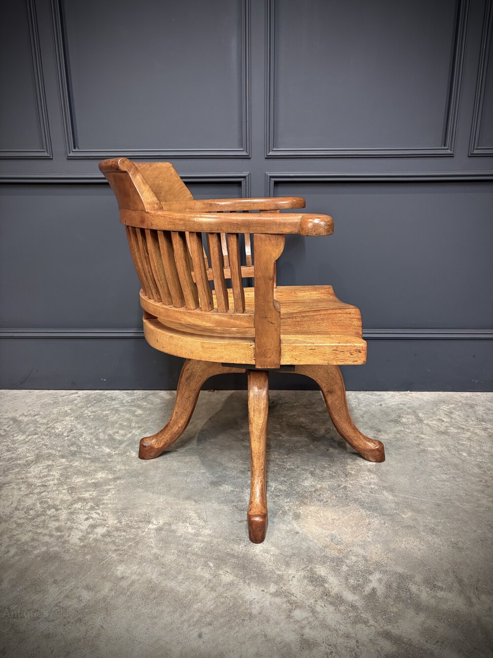A lovely light mahogany swivel desk chair in excellent condition. Circa 1900.Crafted from solid, good-quality mahogany, this chair features a beautifully shaped seat and an elegant slatted curved backrest. The wood has a warm, light-toned finish that highlights its natural grain.