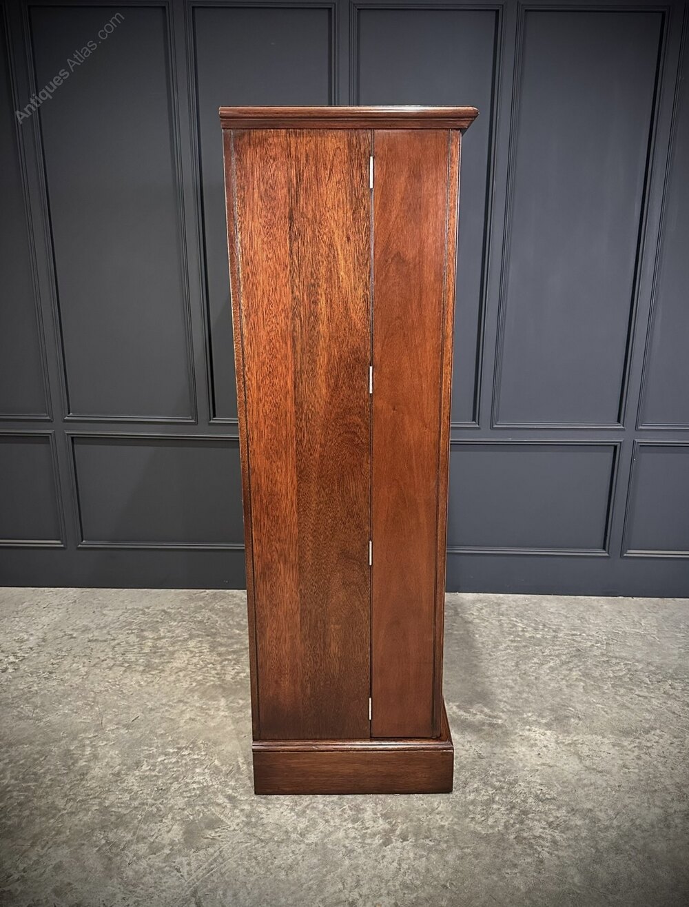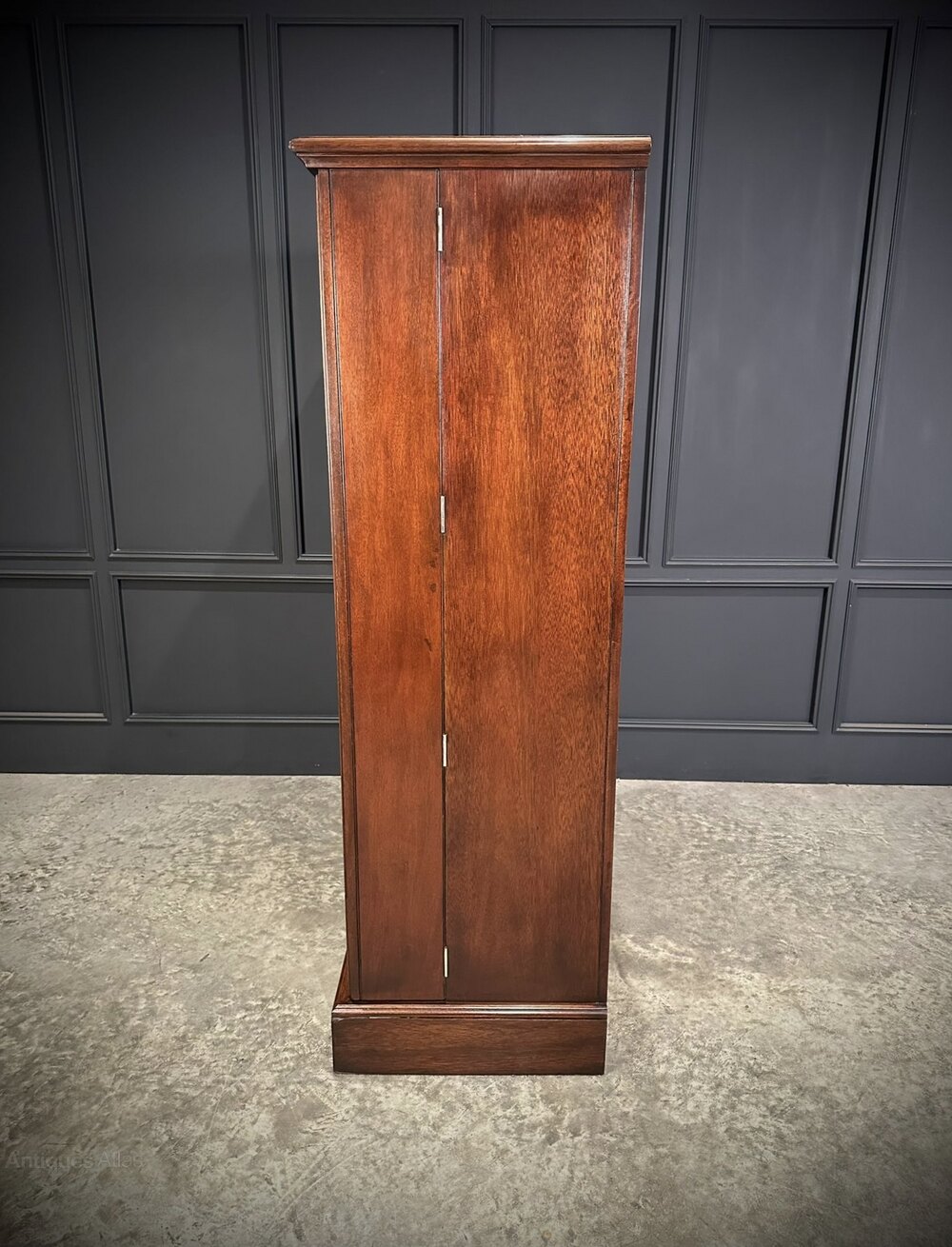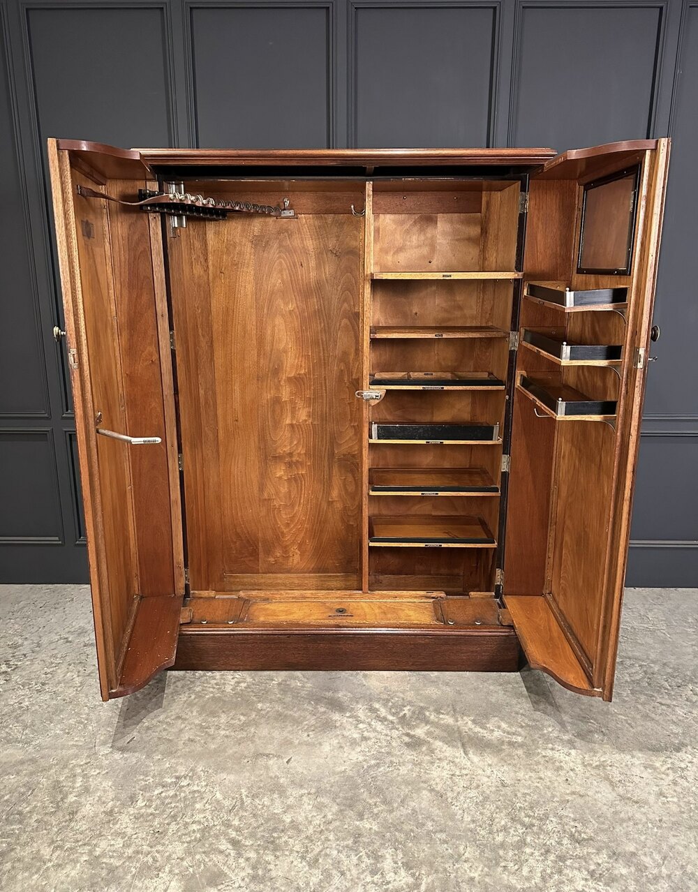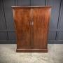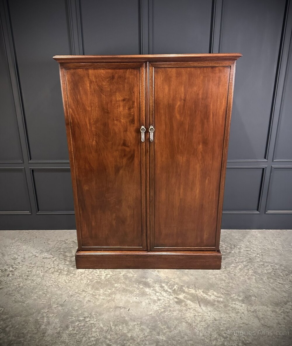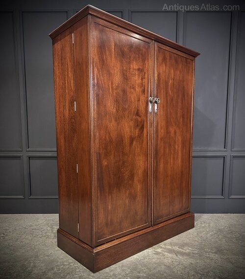 An excellent quality circa 1920 mahogany compactum wardrobe, beautifully proportioned and finished with notably deep, clean panelled doors, allowing for generous and practical storage. The wardrobe has been professionally repolished and now presents in excellent condition, with a rich colour and attractive grain throughout.The interior is thoughtfully arranged, featuring a hanging section, alongside a series of graduated shelves and pull-out compartments, with additional storage fitted to the doors and a mirror. Retaining its original hardware and fittings, this wardrobe offers impressive storage in a compact footprint.