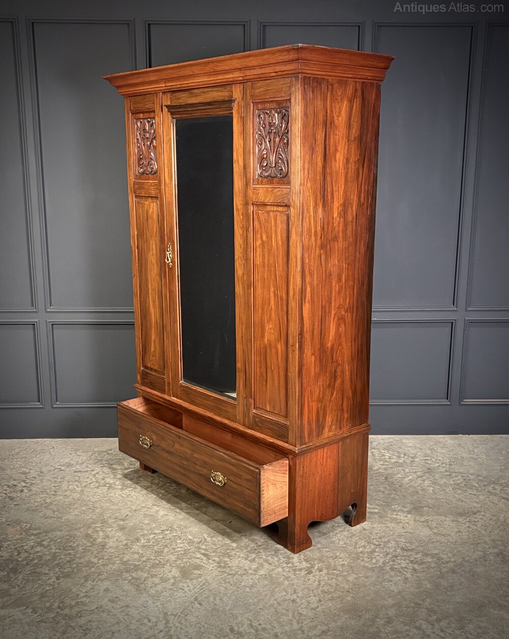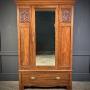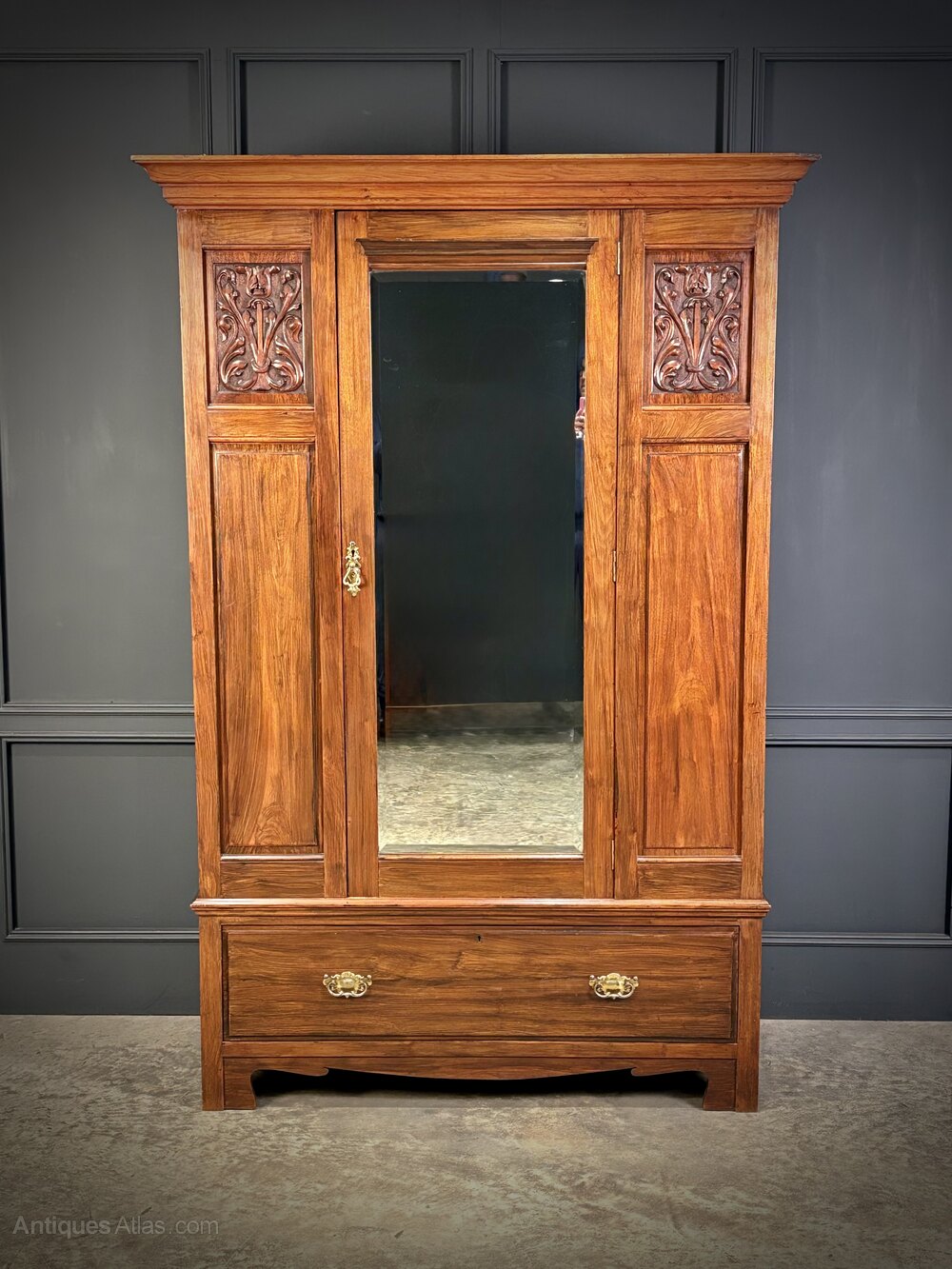 A handsome Edwardian walnut wardrobe of excellent colour and figure, presented in three sections for ease of transport and installation.The moulded cornice sits above a central single mirrored door, flanked by beautifully carved decorative raised panels featuring stylised foliate detailing.