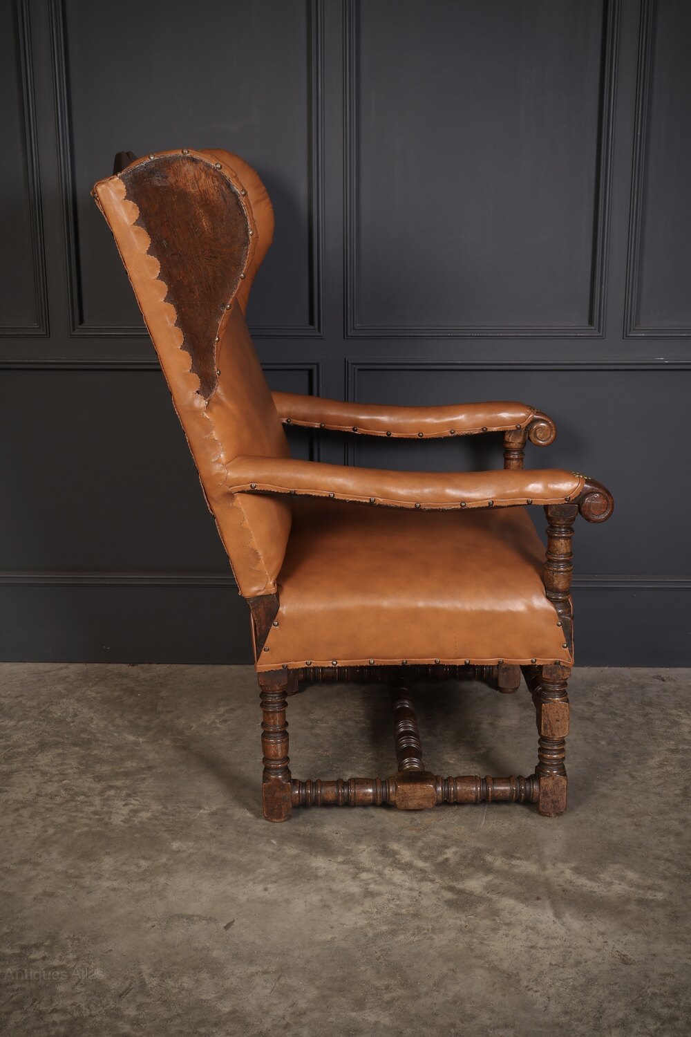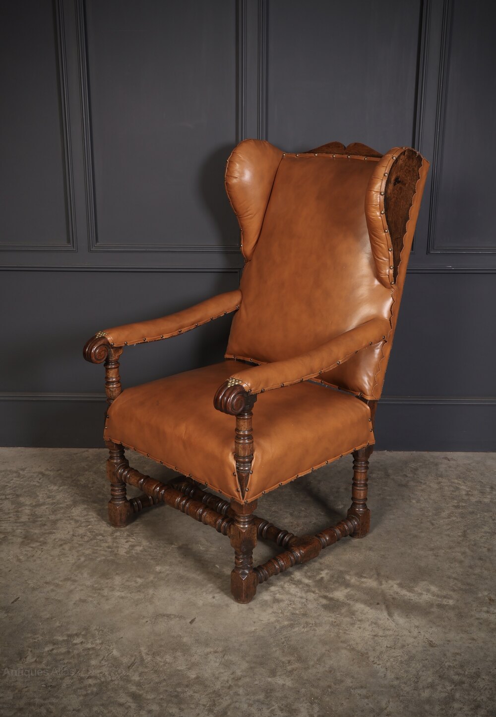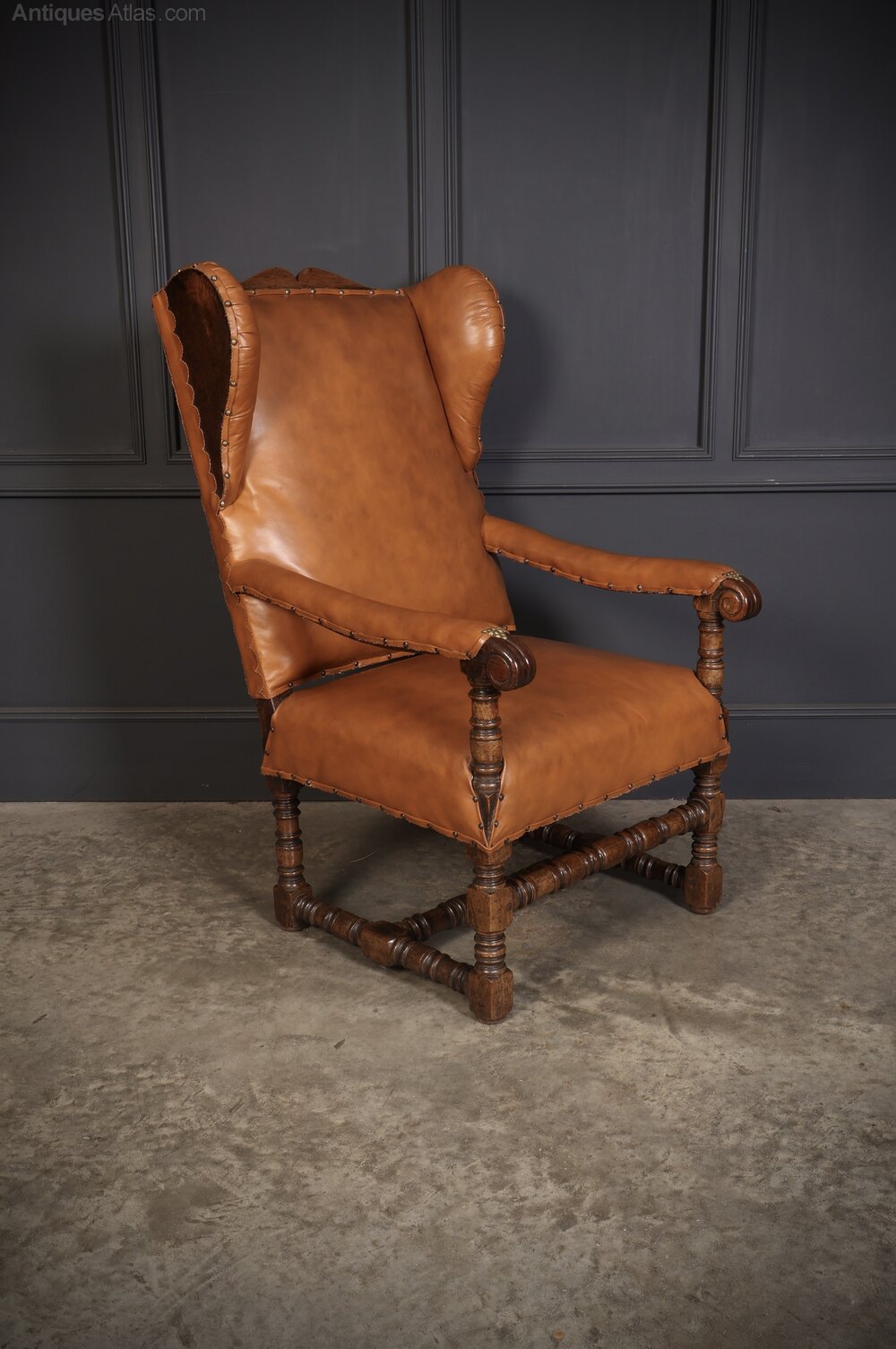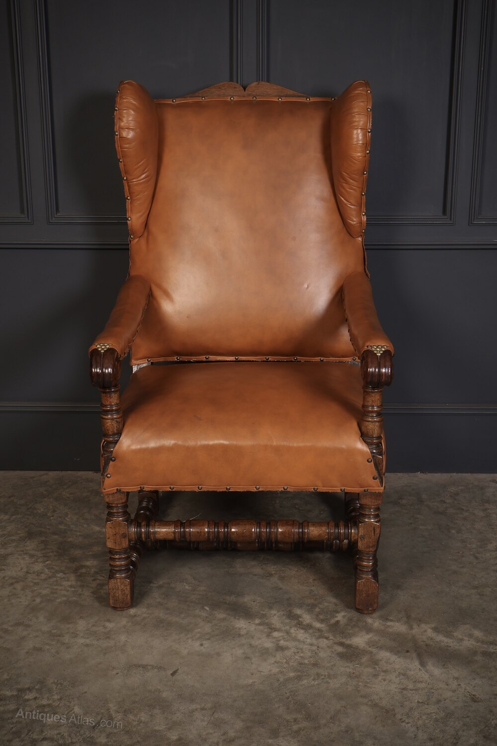 This charming antique oak armchair features a robust oak frame and rich tan leather upholstery. The chair is designed in a classic wingback style, offering a high backrest with gracefully shaped wings that provide both aesthetic charm and functional comfort. The supple leather upholstery is hand-stitched and adorned with decorative brass nailhead trim.The armrests are upholstered in the same leather, with delicate brass detailing at the joints for added refinement. The sturdy oak frame showcases expertly reel turned legs and stretchers, the warm patina of the wood complements the deep caramel hues of the leather, creating a sophisticated contrast.