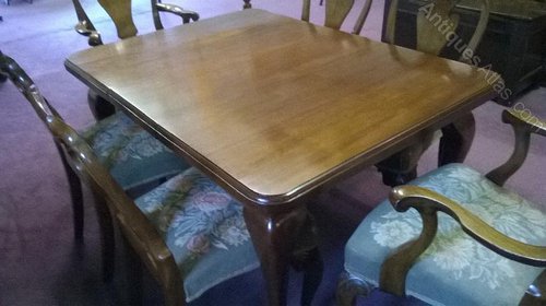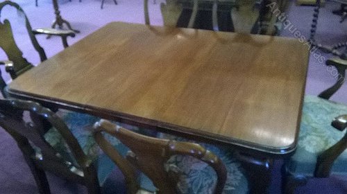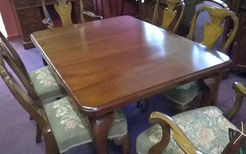 This Mahogany extending dining table has been through our workshops and is now in great condition.(One of 50 in stock) It is a windout style table and shuts down to seat four people but extends to seat six as can be seen in the pictures. It goes very well with the set of chairs currently around it and comes at at highly competitive price. We have a couple of sets of four chairs with a matching leg if these six do not appeal. It can of course be sold on its own if need be. We also have a similar eight seater table which is waiting restoration and can be restored as required for the new owner. ........RESERVED.........We have been in business for 40 years and are now coming up to retirement. We are in consequence looking to reduce our stock, Delivery can be arranged with a specialist carrier for around £70 to most areas. We now open by appointment, but we are often open Fridays and Saturdays, but cannot guarantee,( our sign will be out if passing ) it is worth ringing before coming.Tel 01565 874075