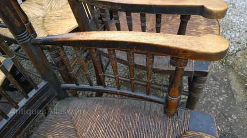 The chairs have a good shape arm and spindles between the legs for strength, note the twin stretcher, nicely turned, between the front legs. ..................