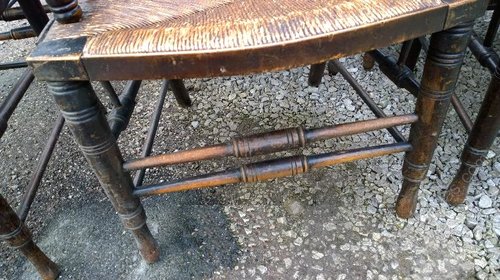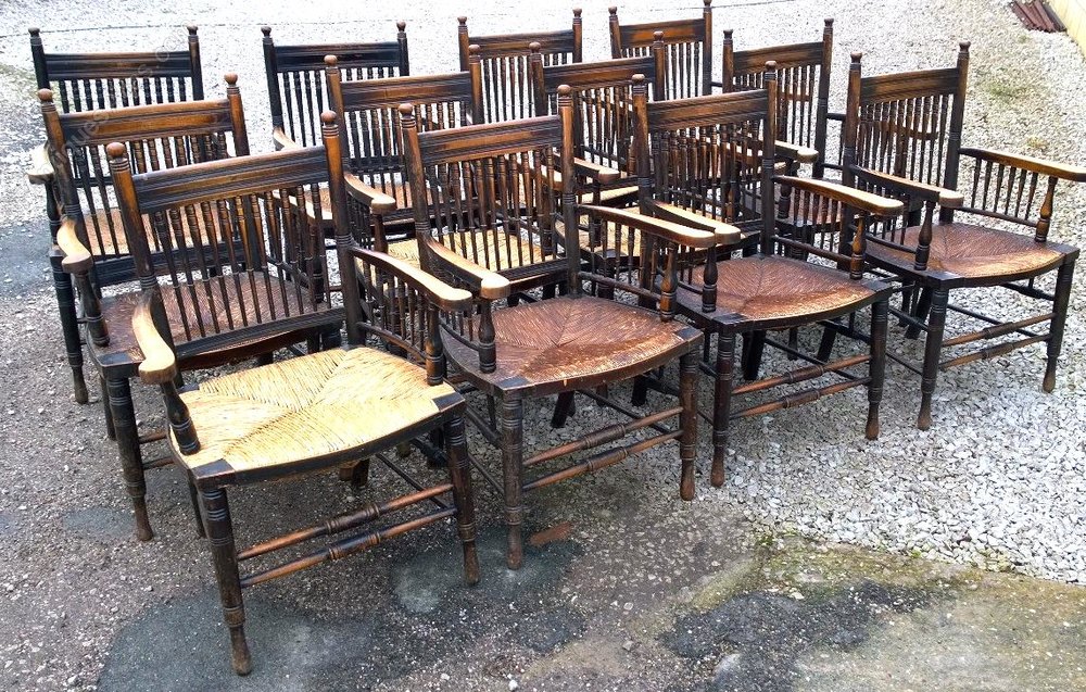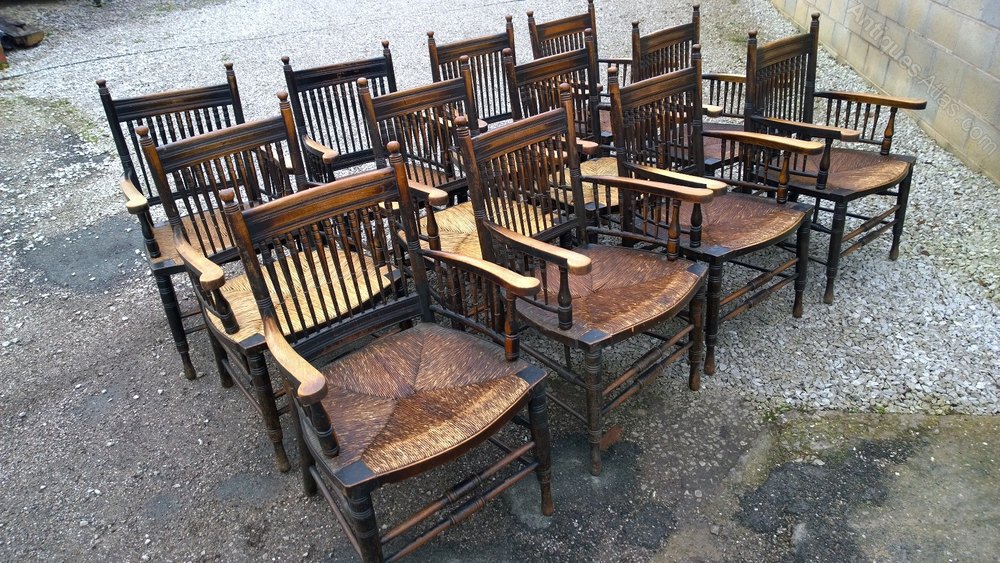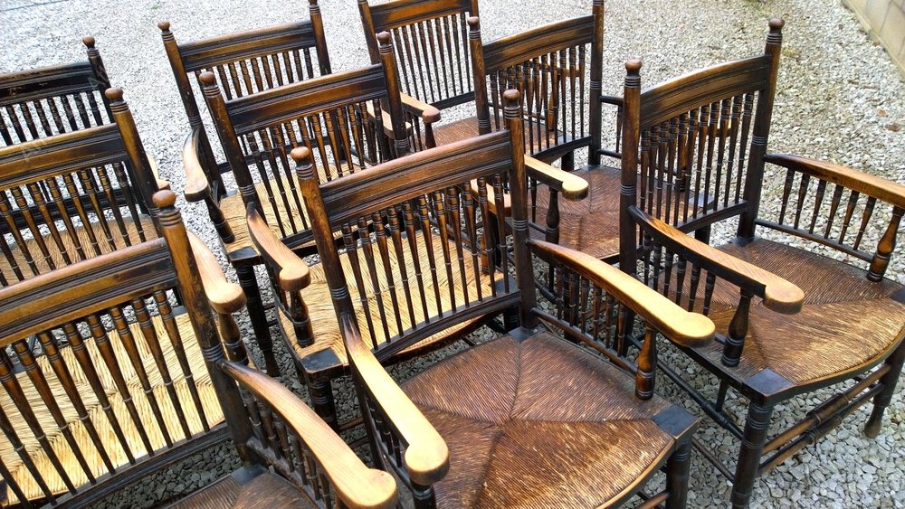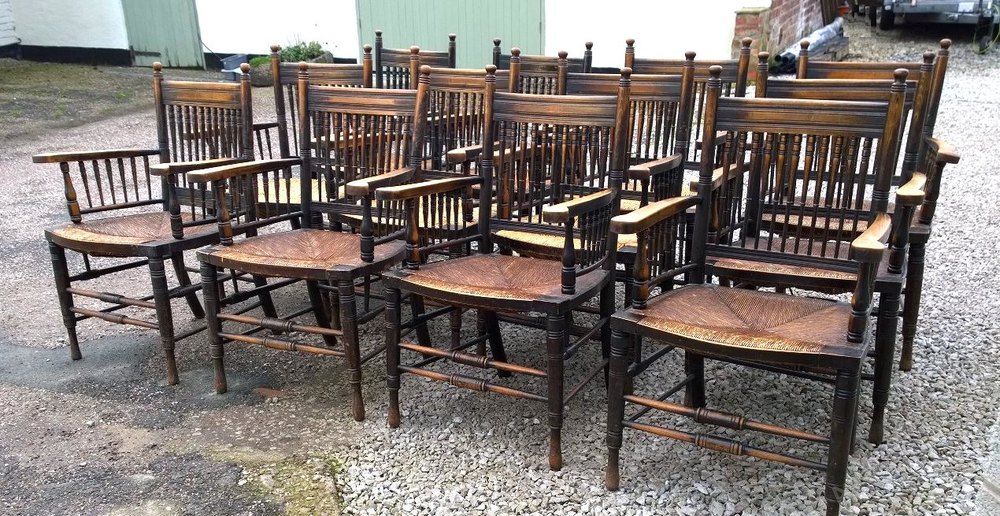 A very rare find indeed, this set of 12 arm chairs in the arts and crafts design are most unlikely to be repeated any time soon. We can honestly say that in the last 40 years we have never had a similar set. The odd chair or maybe a pair can be found of course but this number is so unusual. The chairs are generally in good condition, seats are all tidy and useable, some have been rerushed in the non too distant past. There are a couple of joints that we will rejoint before the chairs leave our premises. These chairs are in an unrestored condition, we are getting asked for some items that are a bit more rustic, these chairs fit that bill so unless asked we will sell them as they are at what we believe to be a stunningly keen price, £1500. That is only £125 per chair, about half what many people are asking for a single chair, just check out antiques atlas web site.There should be a serious premium on a set of 12 so these chairs a exceedingly competitive. We will clean and French polish them if asked to do so, that will about double the price, still not bad mind you.