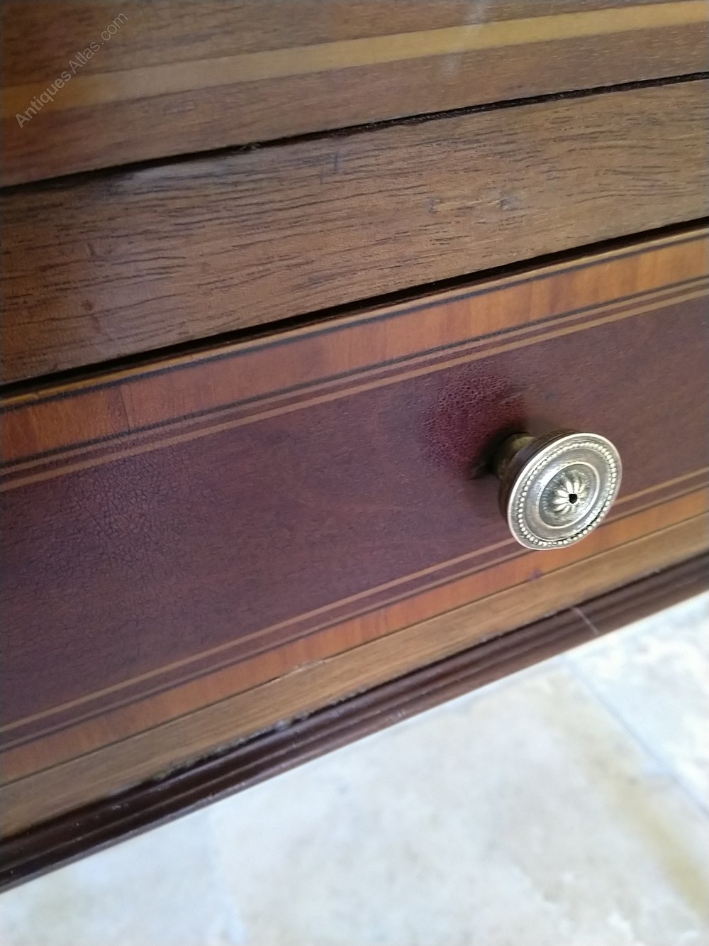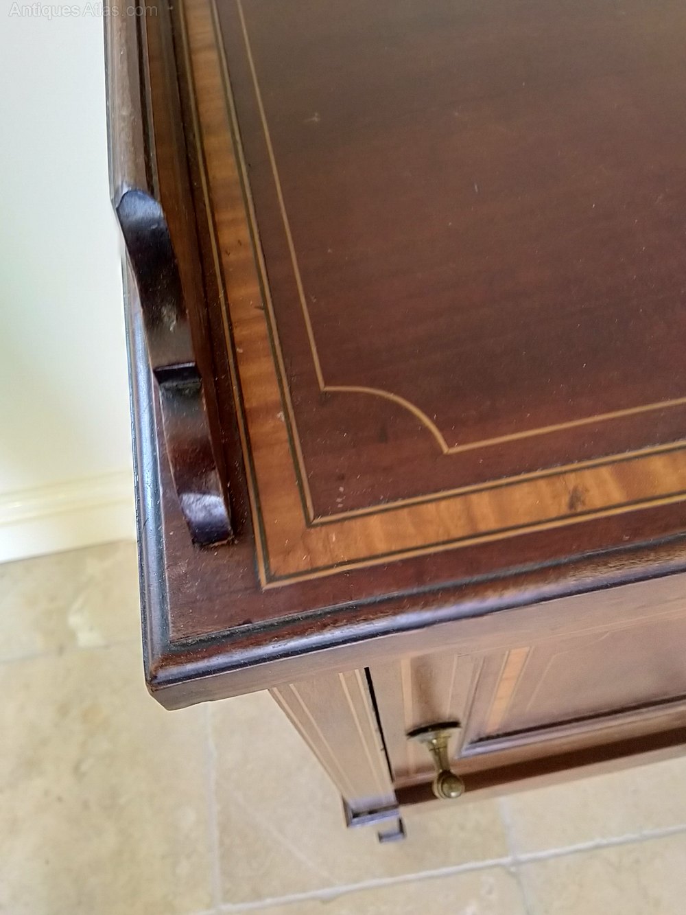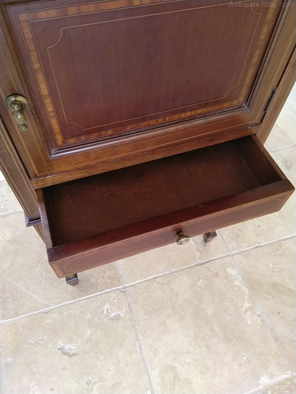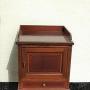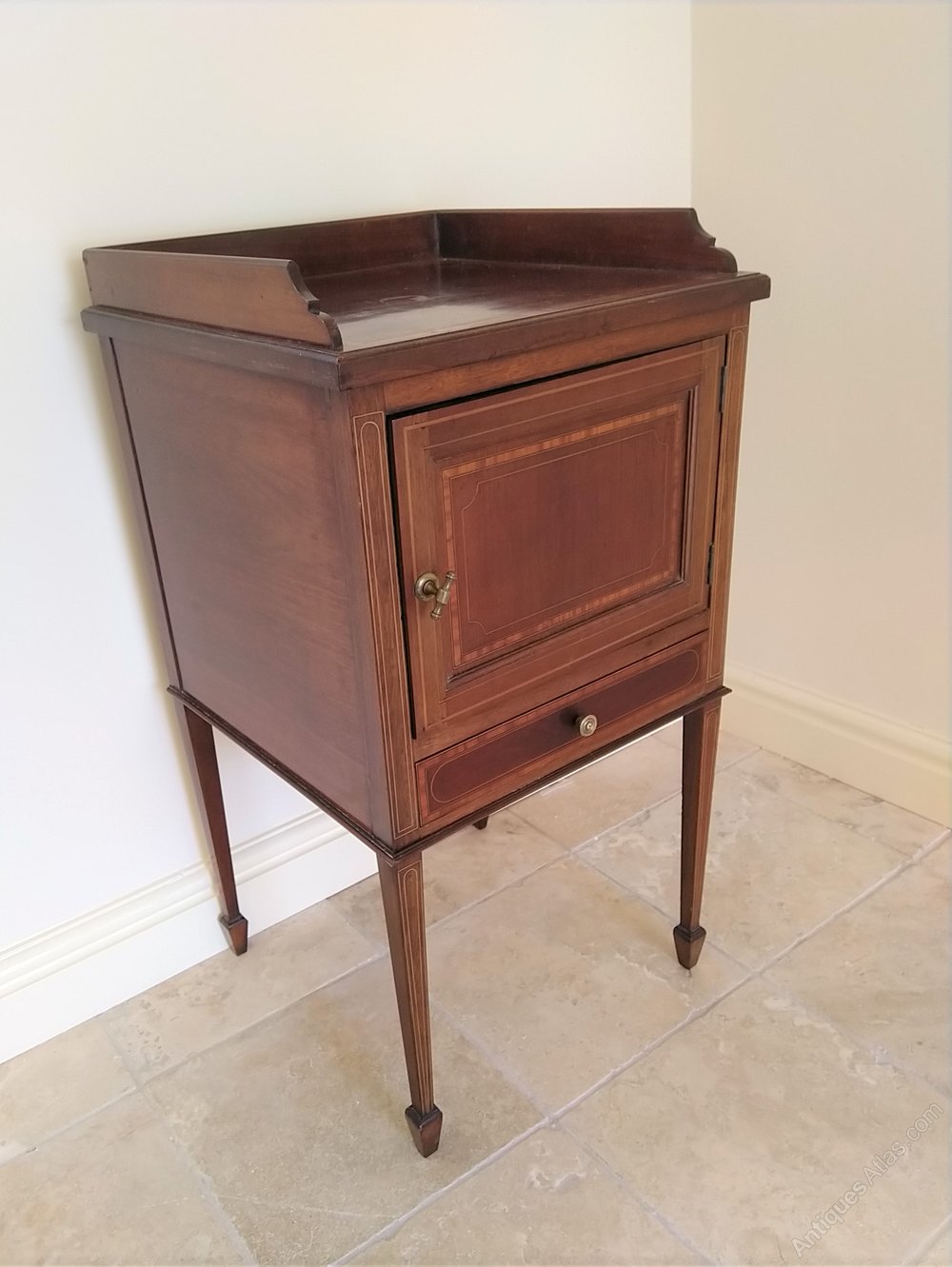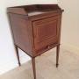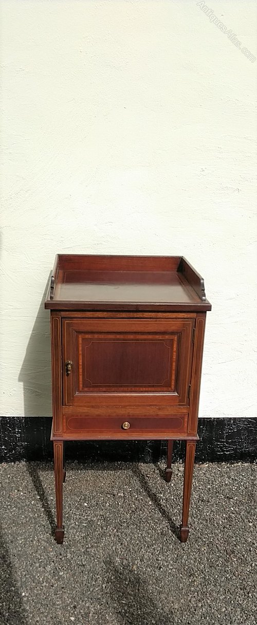 A really useful inlaid mahogany cabinet from the early 1900s in good original condition. Nicely inlaid even down the leg which ends in a spade foot. This can be a bedside caninet, a side table for a lamp etc or possibly a hall table , great for keys and gloves etc. The small inlaid drawer carries a typical Sheraton style handle to compliment the overall style and the door boasts a fully operation twist catch. All in all a good looking tidy little piece of furniture with lots of uses at a competitive price with a galleried top to ensure items do not fall off.We have been in business for 40 years and are now coming up to retirement. We are in consequence looking to reduce our stock, Delivery can be arranged with a specialist carrier for around £70 to most areas. We now open by appointment, but we are often open Fridays and Saturdays, but cannot guarantee,( our sign will be out if passing ) it is worth ringing before coming.Tel 01565 874075