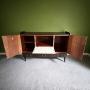 A very handsome sideboard from the 1950s, by UK manufacturer Scully Furniture. The cupboard fronts have an attractive checkered pattern created by the striped veneer of the sapele wood. The unit is trimmed with brass strip, has tapered black legs, and black and brass handles. It has a cupboard on each side, the left with an internal shelf, and a central drinks cabinet with 2 internal glass shelves and formica door, for drinks preparation. There are 4 drawers.Dimensions: Width 137cm, Height 94cm, Depth 46cm.