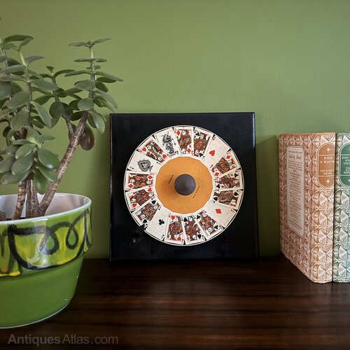 A vintage spinner for the game 'courtette', most likely dating from the first half of the 20th century, featuring picture cards (Jack, Queen, King, Ace, Joker). An attractive and interesting item for display in lovely vintage colours, or for playing courtette if you know the rules!Dimensions: Height 23cm, Width 23cm, Depth 5cm.