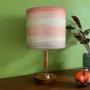This solid teak and brass table lamp dates from the 1960s and has a pushbutton switch on the base. It has been paired with a later vintage textured shade in subtle reds, purples and neutral colours. The underside is covered with green felt to protect your tabletop.Dimensions: Base Diameter 14cm, Shade Diameter 25.5cm, Height (without shade or bulb) 28cm, Height (with shade) 45cm.