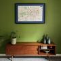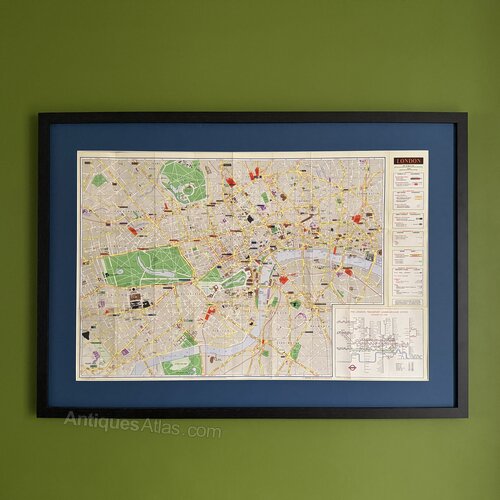 A genuine 1960s map of London with beautiful muted colours, framed with a blue mount and black frame. The frame is wood with acrylic 'glass'.Dimensions: Width 107cm, Height 74cm.