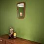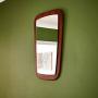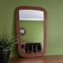 A mid century wall mirror mounted on solid teak. The mirror, slightly wider at the top than bottom, combines elegance with a fun, retro feel. It has its original fixings on the reverse.Dimensions: Height 59cm, Width 38cm.