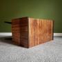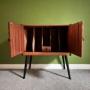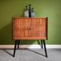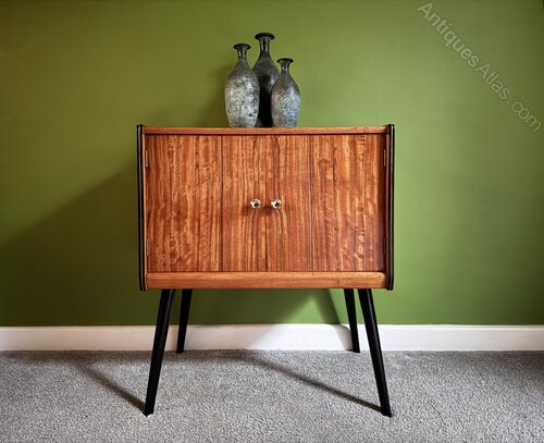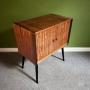 This is a charming and beautiful cabinet designed to hold vinyl records (both LPs and 45s) by British maker 'Homeworthy'. It is in a classic 50s atomic style with tapered dansette legs, painted black. The body of the cabinet is veneered in exotic wood, with lovely grain. It has brass effect knobs and trim on the edges.Inside are 4 compartments for vinyl albums, and 1 smaller compartment originally designed for vinyl singles. They could also be used to store files and documents. There's a small drawer with a Bakelite knob intended for a spare stylus, or it could be used for pens and stationery.