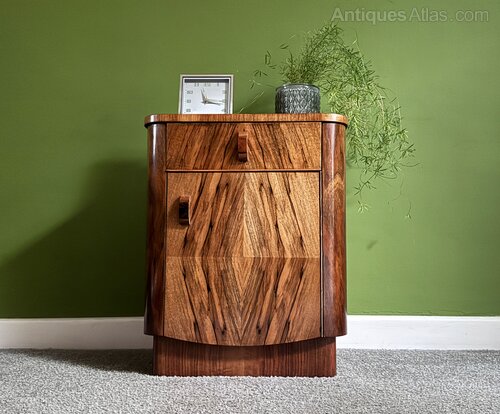 A beautiful cabinet veneered in exceptional figured walnut, understood to be by Czech designer Jindrich Halabala. Designed in 1921, this cabinet has all the glamour of the Art Deco era gentle curves, delicate colours and intricate patterns.The cabinet has one drawer and a cupboard beneath. It is made of hardwood, finished with iridescent walnut veneer, laid in an attractive symmetrical (book match) pattern. 'Made in Czechoslovakia' is printed on the back.