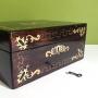 A beautiful heirloom jewellery box dating from 1858, made of rosewood and decorated with lovely floral motifs in brass, abalone and mother of pearl. The box has a lovely dark green interior in velvet and satin, and there is a working lock and key. On the base is paper with a handwritten inscription dating the box to 1858. This would make a perfect gift for someone special, to pass down the generations. There is ample room inside for jewellery or keepsakes.Dimensions: Width 27.5cm, Depth 20cm, Height 12cm.
