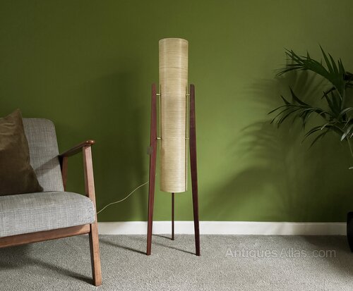 An original, iconic 60s rocket lamp, with teak tripod legs and spun fibreglass shade. These lamps became very popular in the 60s and 70s, usually in shades of orange and yellow this one is a pearlescent cream which shimmers when unlit, and glows warmly when lit. The lamp is in very good original condition and still has its original care label attached.Dimensions: Height 112cm, Shade Diameter 15cm, Overall Diameter 26cm.