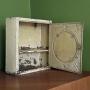 A small metal wall cabinet with Art Deco styling, a round mirror, and plenty of patina! In original shabby condition, the cabinet was originally painted green and then overpainted in pale primrose yellow. This has worn to reveal the green and bare metal underneath. Although the cabinet is shabby, it has had a good clean. Inside is a shelf, and there are 2 holes in the back to allow it to be hung on the wall. Please examine the photographs and feel free to ask us any questions, or request more pictures.Dimensions: Width 28cm, Height 31cm, Depth 10cm.