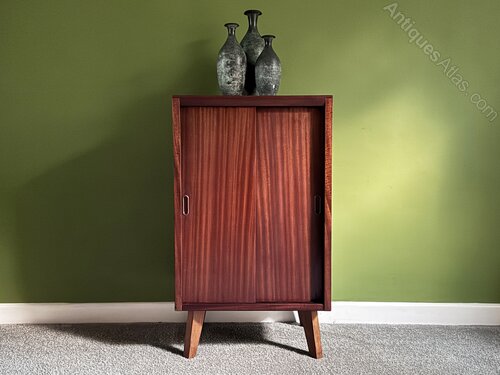 An unusual double height vinyl record cabinet dating from the 1950s with original beech interior. The cabinet has classic 1950s mid century modern styling with 'atomic' splayed legs in elm. The cabinet is a rich mahogany or teak with lovely grain, and has sliding doors concealing 5 compartments for LPs. These could also be used for books or files if preferred. The original maker's label is inside, showing that it was part of the 'Stentorian' range made by Whiteley Electrical Radio Co. Ltd. based in Mansfield.Dimensions: Width 48cm, Height 82cm, Depth 38cm.