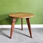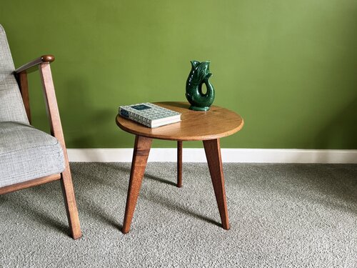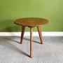 A circular side table made of solid, light oak, supported on 3 tapered legs. This quality table dates from the 1950s and captures the elegant simplicity of the mid century modern movement. Perfect as an occasional table or plant table, it is sturdy and stable.Dimensions: Diameter 45cm, Height 42cm.