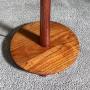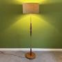 Teak and brass standard lamps are style icons of the 60s and 70s, and this one has a classic design with its turned solid teak decoration half way up the brass stem. The lamp also has a solid teak base with 3 bun feet. The lamp has been paired with a modern green textured shade - if preferred it can be purchased without.The lamp is in very good vintage condition there is minor patina on the brass and a few marks on the solid wood base. The wood has been stripped and refinished in oil and protective wax. It has been rewired with gold flex and a black plug, is in good working order and has been PAT tested. The lamp takes a standard bayonet cap bulb (B22), one supplied.