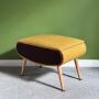 Sherborne 'Pandora' sewing cabinet / foot stool in original Paprika fabricThis mid century, 1960s foot stool is in great original condition. The stool has beech dansette legs with adjustable brass feet, and the original fabric is a rich dark gold with contrasting brown on the sides. There is a lid with a brass chain, with the original paper label attached. The interior is lined with primrose yellow vinyl, and has a handy pocket, a channel which is perfect for sewing threads, and a generous space for fabrics. Of course you could equally use the storage for books and magazines, or anything else! (please note the contents shown in the photo are for illustration only and not included in the sale price).
