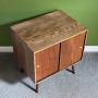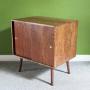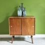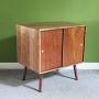 A small medium oak cabinet made by British manufacturer Unix in the 1950s, ideally sized for vinyl LPs with 2 internal compartments behind sliding oak doors with white Bakelite handles. The cabinet stands on atomic legs and has lovely grain. The Unix manufacturer label is on the inside.Dimensions: Width 54.5cm, Depth 39.5cm, Height 57cm.