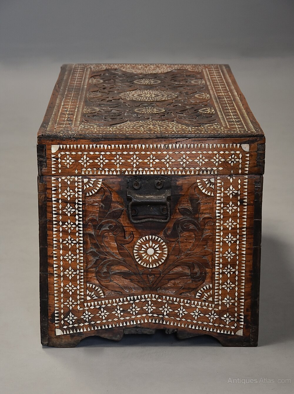 The foliate carved front, sides and back all with profuse mother of pearl inlaid decorative and geometric decoration with carrying handles to the sides and shaped edge below.