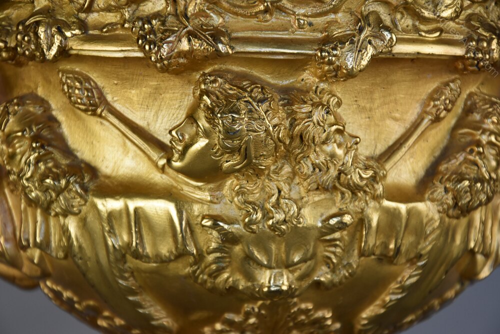 The main body of the vase depicting raised masks of Classical Bacchic Gods (Gods of wine) with grape and vine leaf decoration, with lion pelts and acanthus leaf below, all supported on a fluted socle base.