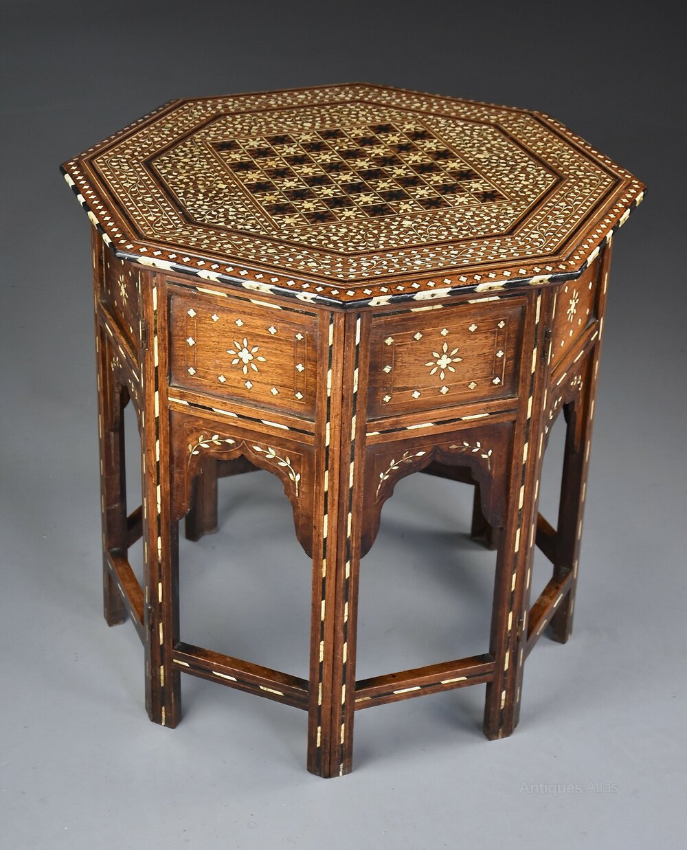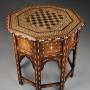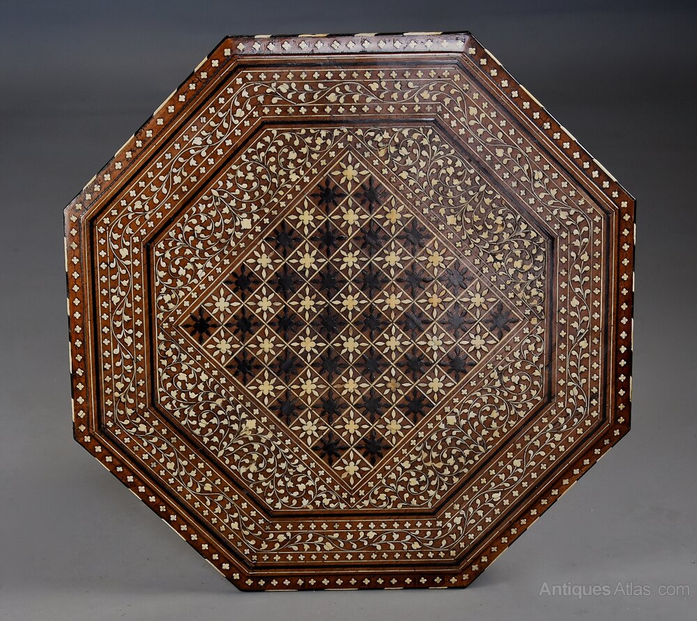 A fine quality late 19th century Anglo Indian ivory and ebony inlaid hardwood octagonal occasional table with good original patina, probably from the Hoshiarpur area in the Punjab, this area renowned for their superb intricate inlay work.This table consists of an octagonal top with central inlaid ebony and ivory chess or games board surrounded by inlaid quatrefoil decoration with floral and foliate inlaid designs with ebony and ivory stringing, further floral and foliate and inlaid quatrefoil decoration, ebony and ivory stringing and outer inlaid quatrefoil design with a moulded edge of ebony and ivory chevron design.