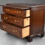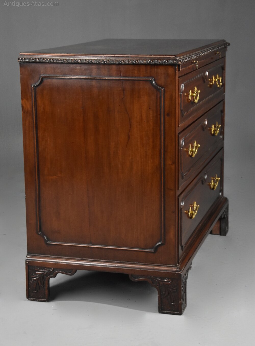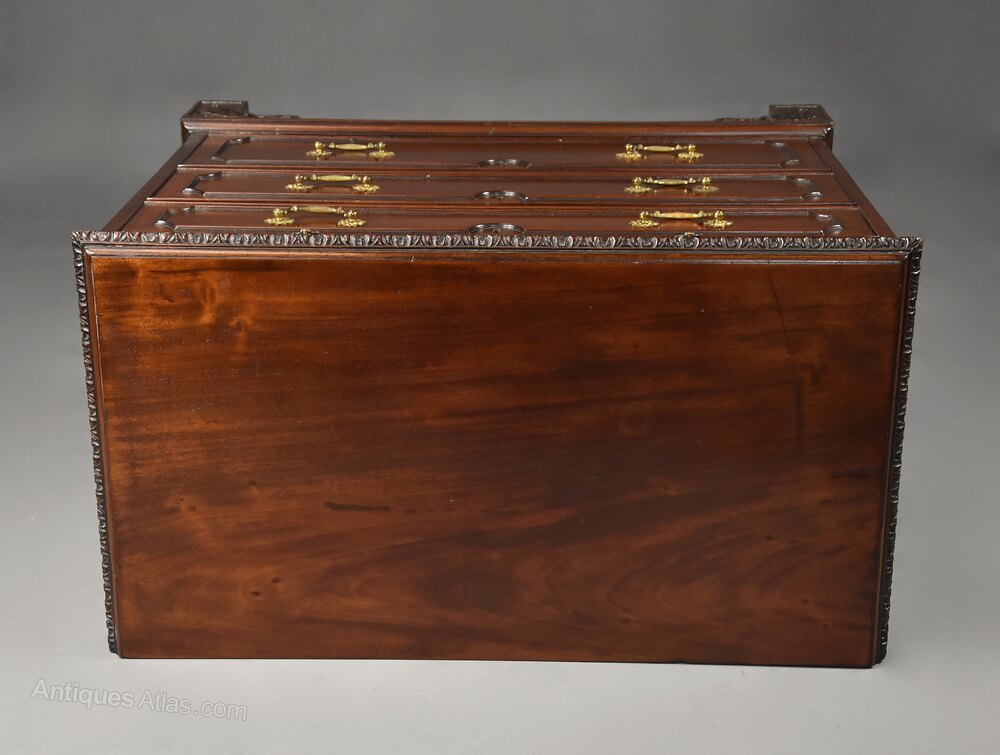 The sides also of solid mahogany with applied moulded decoration, the chest supported by four bracket feet with carved foliate decoration.