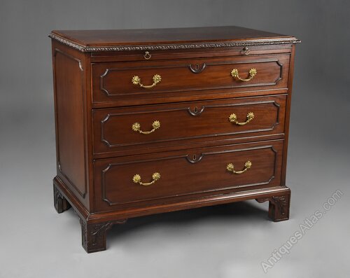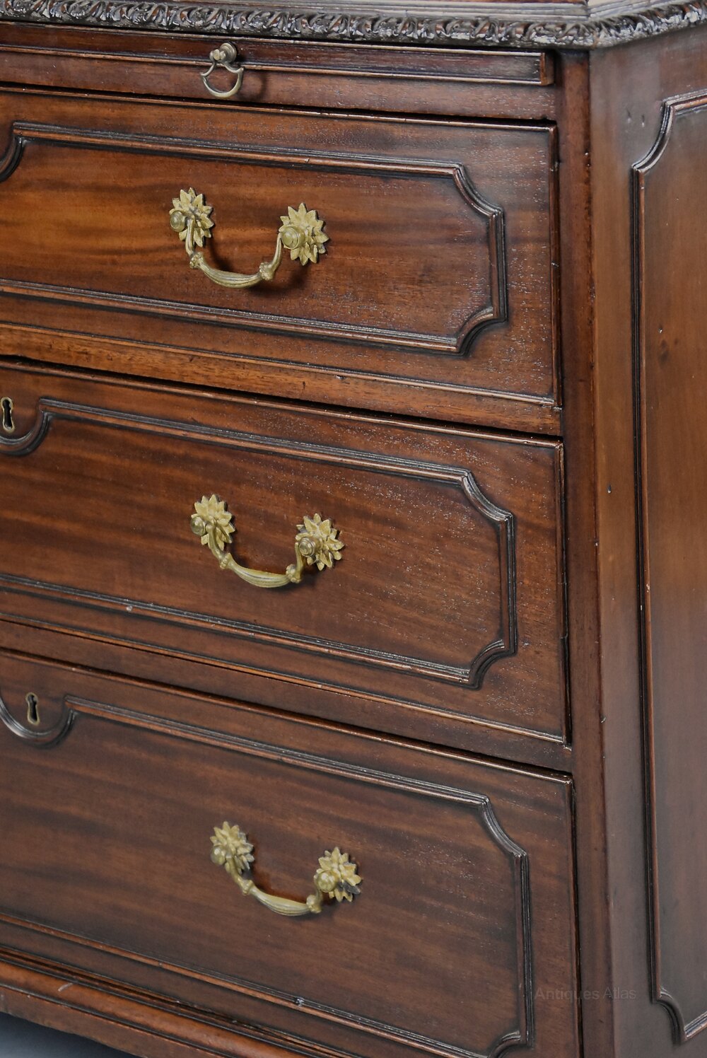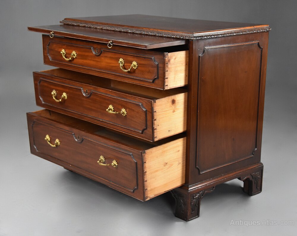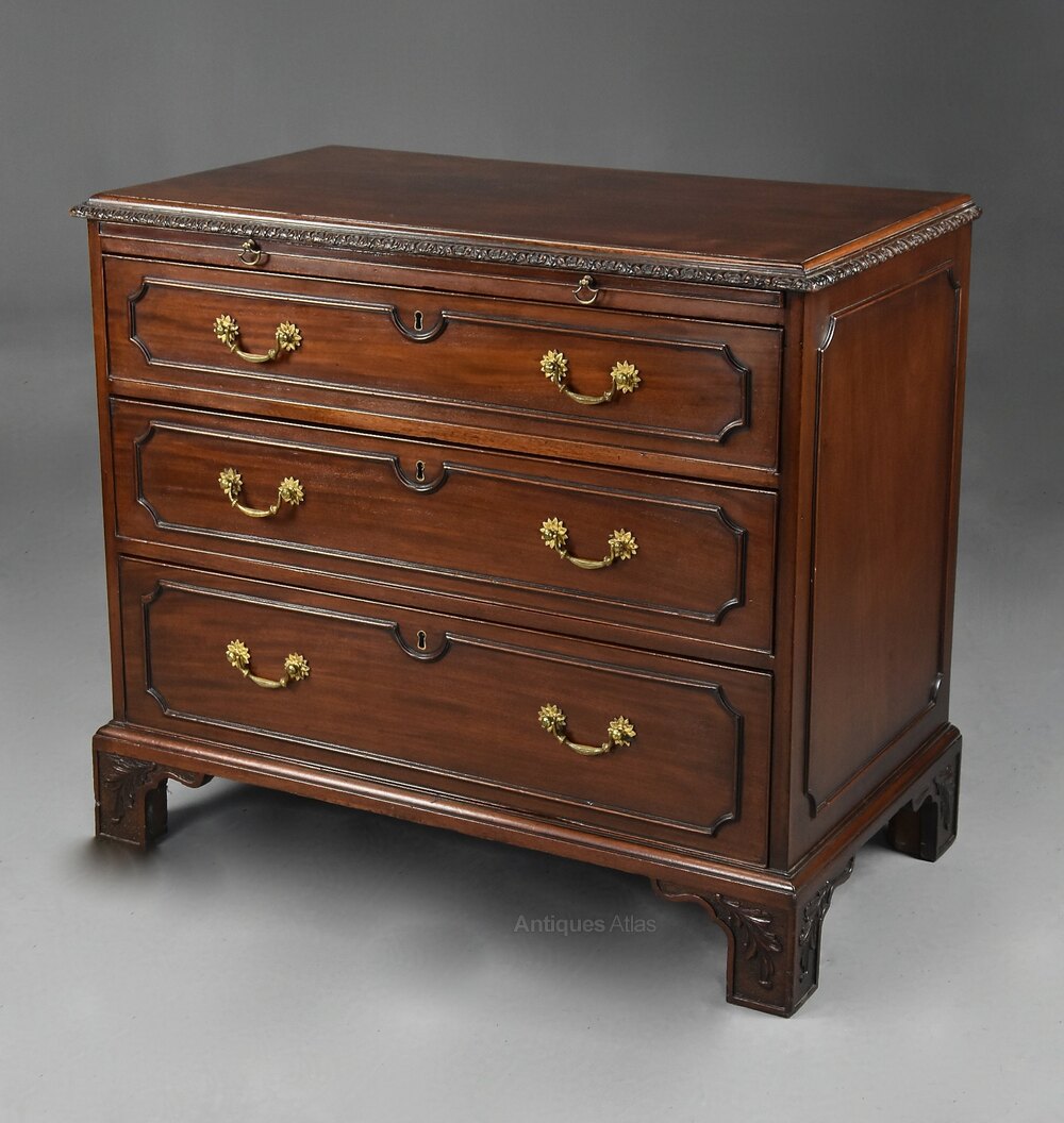 A fine quality late 19th century (circa 1890) mahogany chest of drawers.This chest of drawers consists of a figured mahogany top with moulded edge and carved moulded edge below leading down to a brushing slide with brass drop handles.
