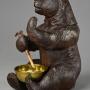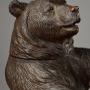 A finely carved late 19th century (circa 1900) Black Forest carved linden wood humidor or tobacco box in the form of a seated brown bear, with a brass mixing bowl at his feet.The bear is seated, his arms outstretched with a a cheroot or cigarette holder in his right paw (possibly not original), his left paw probably originally holding a box of matches. He has a brass bowl resting on his legs either for mixing tobacco, holding matches or as an ashtray, his head lifts and opens up for storage.