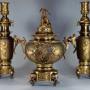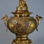 A fine quality late 19th century French Japonisme style gilt and patinated bronze three piece incense burner set.This superb set consists of an incense burner (or koro) with gilt bronze pierced lid with bird decoration and pieced rim below.
