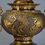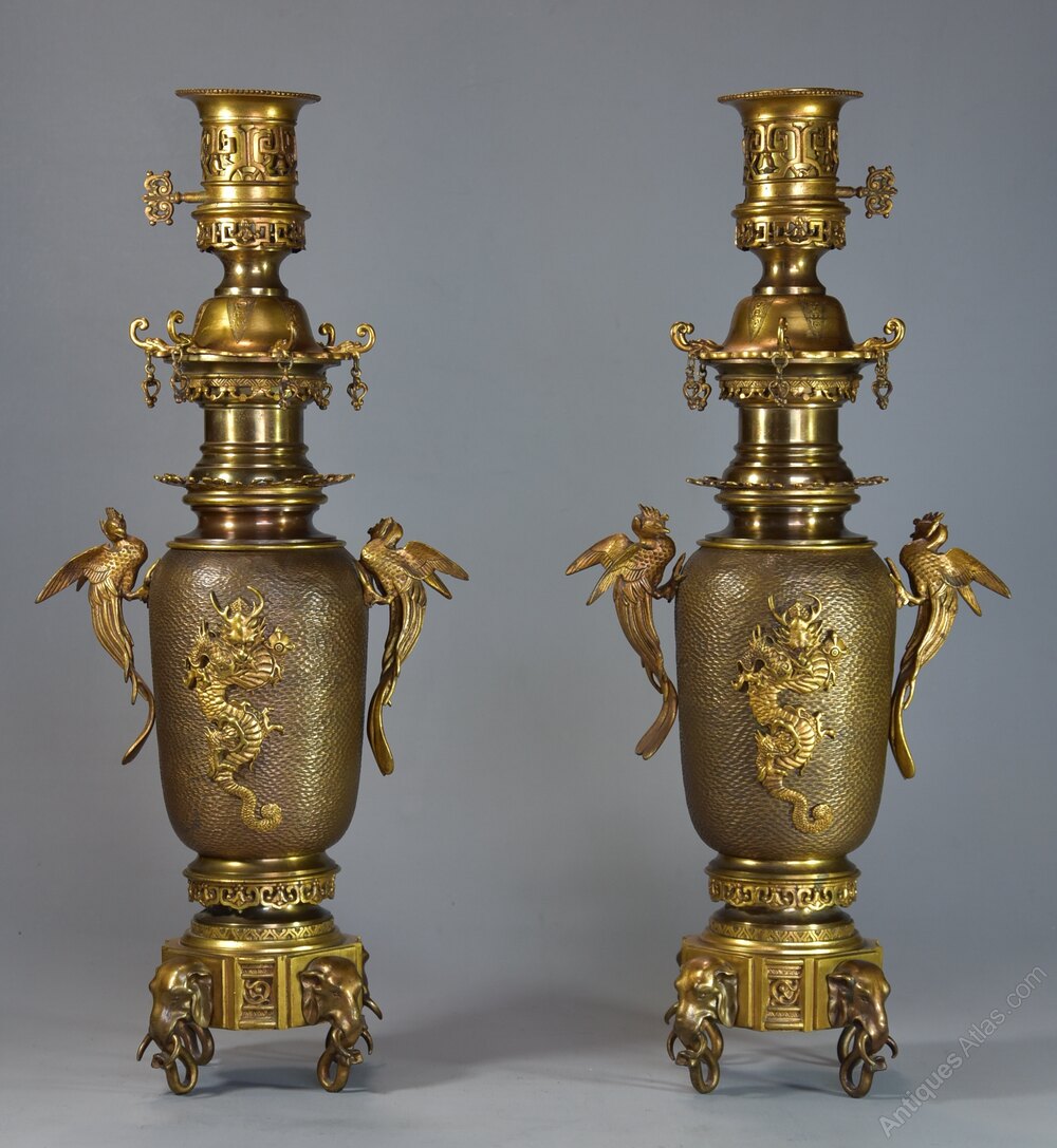 The two ‘garnitures’, originally oil lamps consist of gilt bronze fitments to the top with pierced decoration leading down to the main body consisting of textured patinated bronze decoration with gilt bronze dragon with gilt bronze cockerel handles to either side.