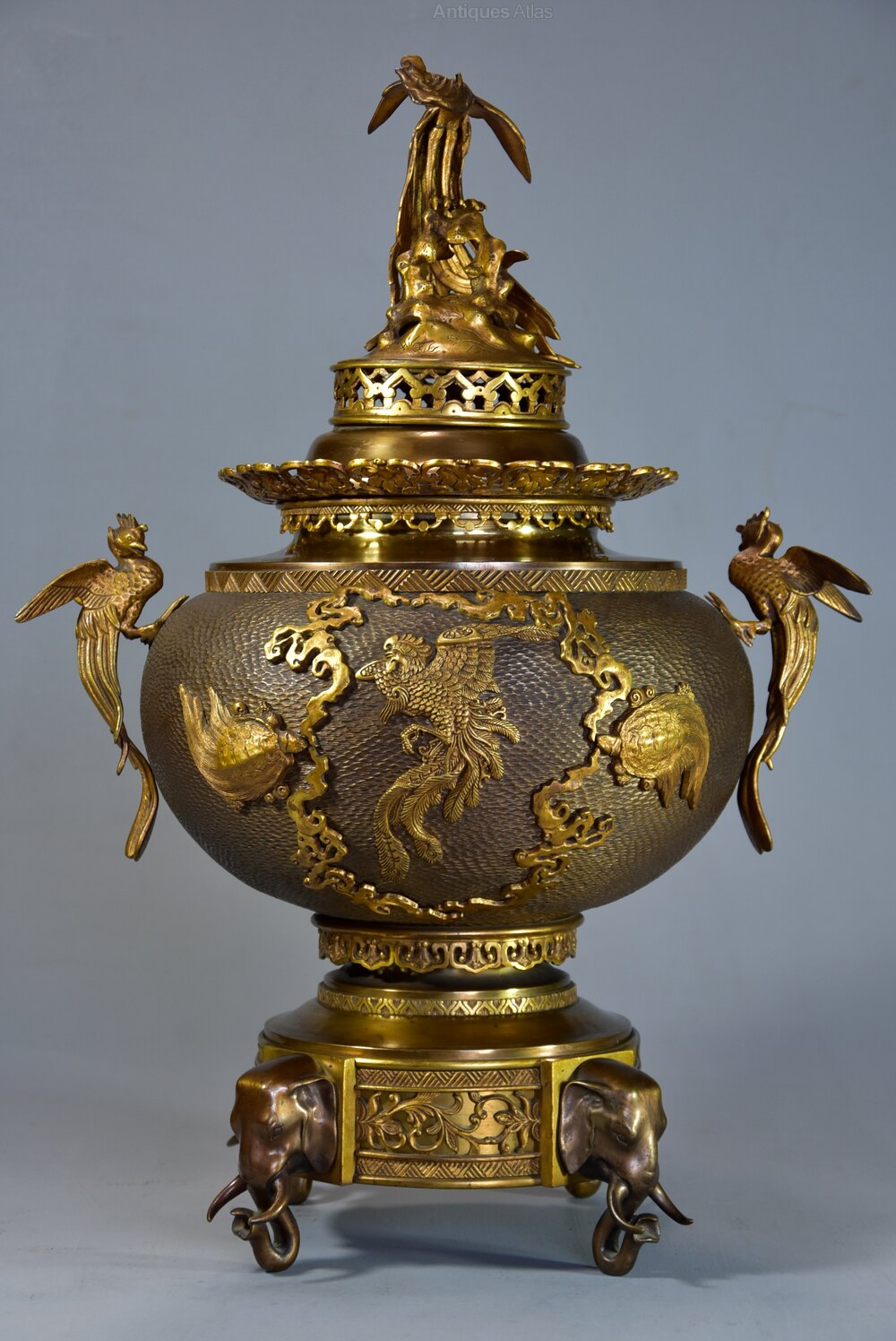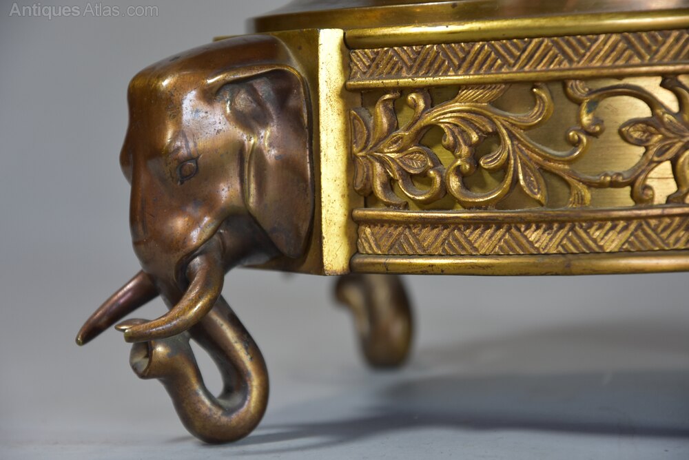 The gilt and patinated bronze base consists of geometric and foliate designs and is supported on four bronze elephant head feet.