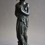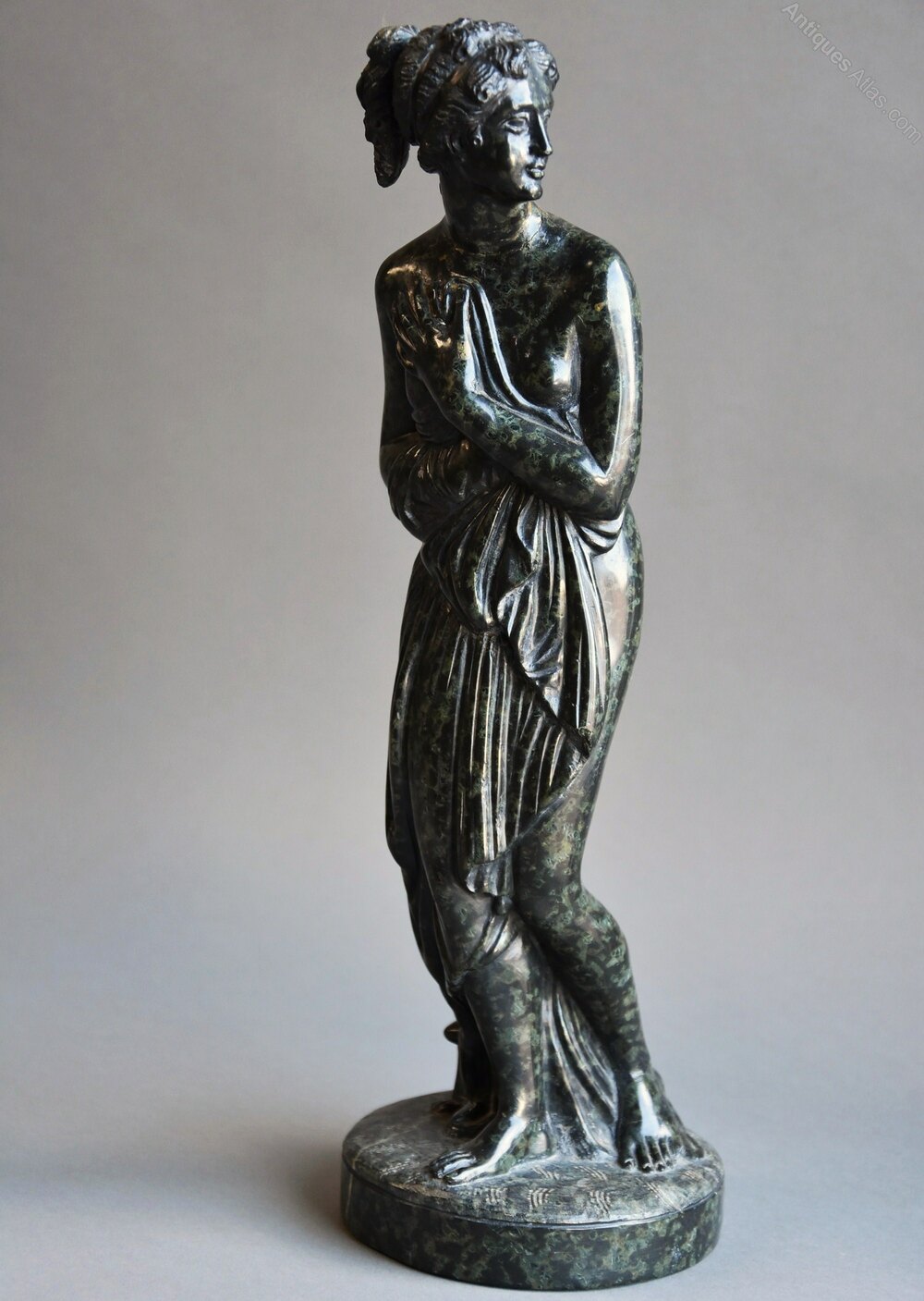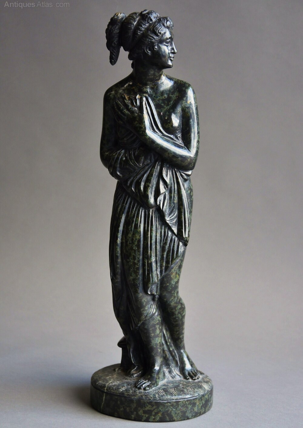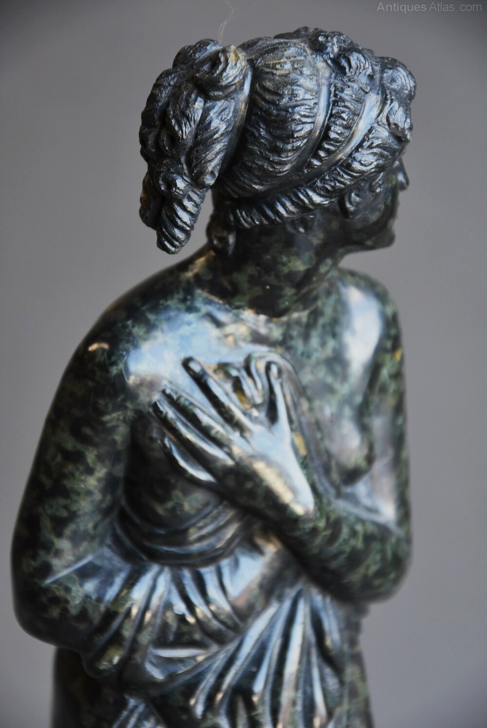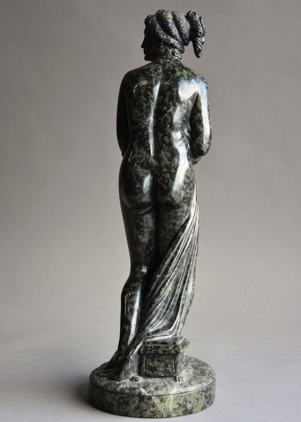 A late 19th century Grand Tour serpentine figure of 'Venus Italica' after Antonio Canova (1757-1822) in verde Prato stone.This figure is Neoclassical in design with Venus depicted holding draped fabric to conceal her nudity and stands on a circular base.