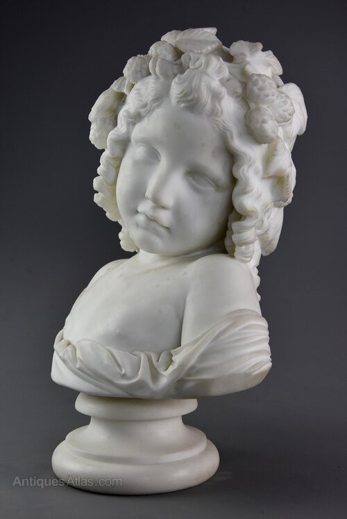 A fine quality early 19th century (circa 1800) carrara marble bust of a young girl signed ‘Houdon’.This marble bust consisting of a young girl with her head to the side with leaves and flowers in her hair, signed ‘Houdon’ to rear shoulder, supported on a circular base.