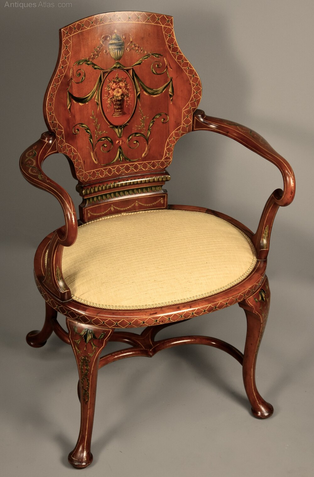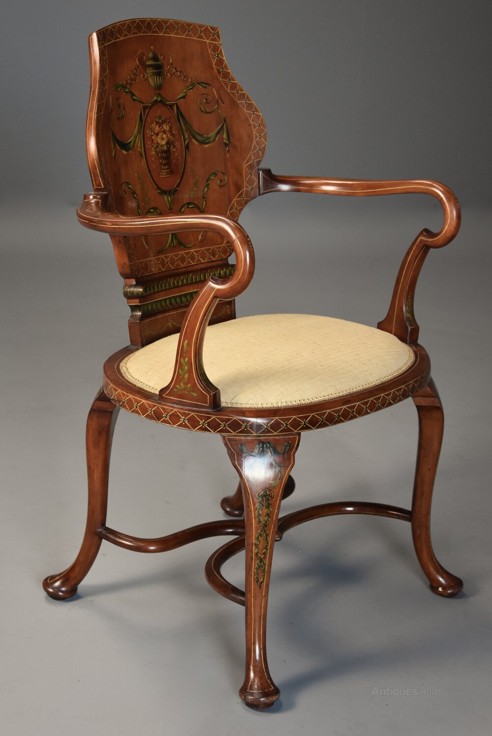 A highly decorative Edwardian satinwood and painted armchair in the Georgian style.This armchair consists of a satinwood concave shaped back in the form of a shield, this being a typical Georgian style, with finely painted Classical decoration of an urn to the top, central oval panel with vase of flowers, draping fabric and foliate designs with painted lattice and floral edge, the back also with painted floral and foliate designs.