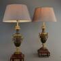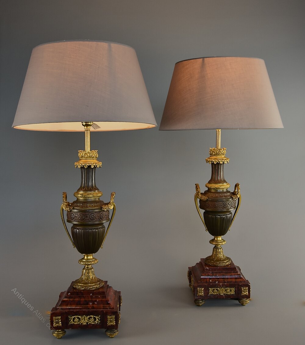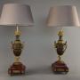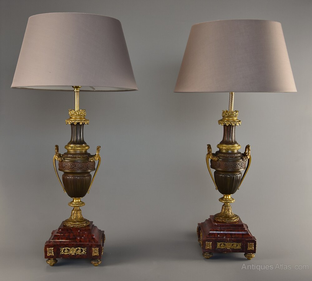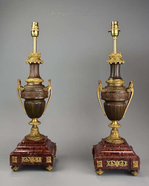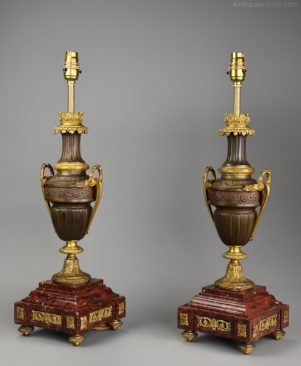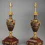 The lamps are each supported on a square rouge marble stepped plinth base with gilt bronze applied and recessed mounts, standing on four gilt bronze laurel wreath feet.