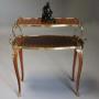 The lower tier also with Kingwood parquetry decoration with gilt metal moulding and also gilt metal ormolu handles to either side forming a tray effect.