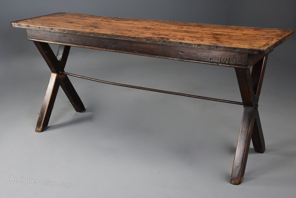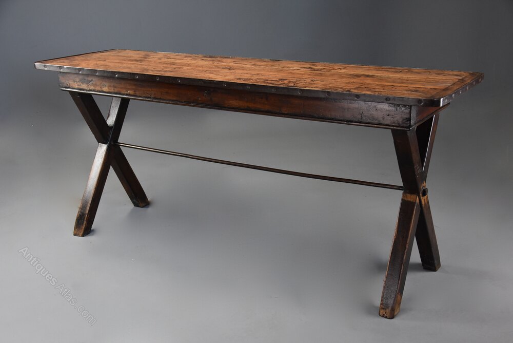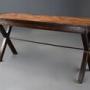 The table is supported by X frame trestle ends with original varnished patina joined by a central steel stretcher for stability.