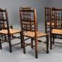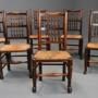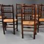 An early 19th century (circa 1830) set of six ash and elm spindle back chairs of superb patina, probably from the Lancashire or Cheshire regions.This set of six single chairs all with shaped rail to the top with two rows of five turned spindles with uprights to either side leading down to a rush seat, all in good condition, the seats having protective wooden strips to the front, sides and back.