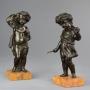 A charming pair of French late 19th century (circa 1880) bronze allegorical Harvest putti on sienna marble bases in the manner of Claude Michael Clodion (1738-1814).The putti both representing the gathering of the Harvest, one with vine leaves to his head with grapes over his shoulder and a sickle in his hand, the other with a wreath to his head carrying a wheatsheaf on his shoulder, both supported on sienna marble plinth bases.